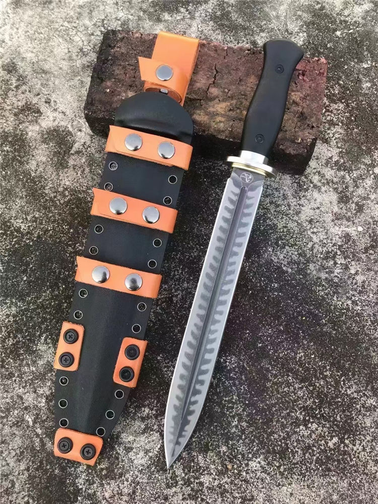 野马兵锋双刃直刀 全长:39.8cm 刃长:27.3cm 刃宽:3.4cm 刃厚:0.6cm 刃材:DC53磨具钢刀条 表面处理:迷彩(沧桑石洗之后喷砂)或钢本砂光 热处理:真空油淬 硬度:60-61HRC 柄材:G10材料,表面CNC防滑纹 刀重:460克 刀鞘:2.0美产进口K鞘+进口意大利手工制作植鞣皮