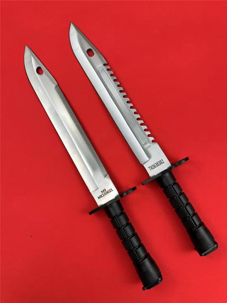 加长版D80-M9军刺 全长:44cm 刃长:33cm 柄长:14cm 刃厚:5.8mm 刃材:5CR17 柄材:ABS 硬度:58HRC 净重:390g 毛重:710g 表面:钢本色