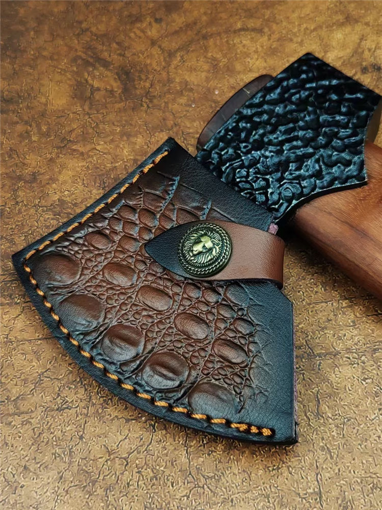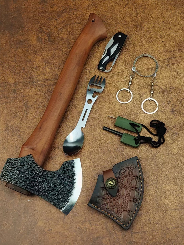 下山·斧 柄长:38cm 斧头刃长:10.3cm 斧头宽度:145mm 钢材:进口CPM-D2合金钢 最大厚度:30mm 硬度:硬度61-62HRC 热处理:上海专业真空深冷热处理 表面:锻打锤纹发黑+镜光效果手 柄材:微粒黄檀木光滑无比人体工学手感一流!爱不释手 包装:手工雕花皮套+黑色手工盒装 配套:打火石、线锯、多功能勺子,折叠刀,牛皮套