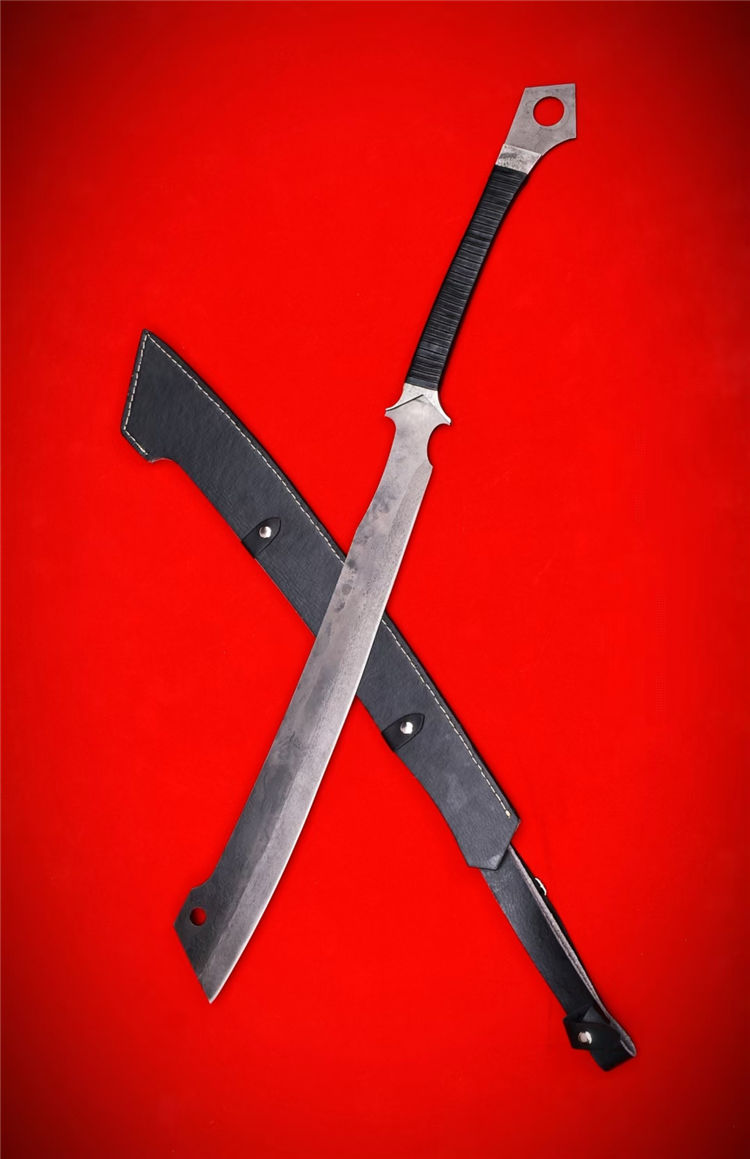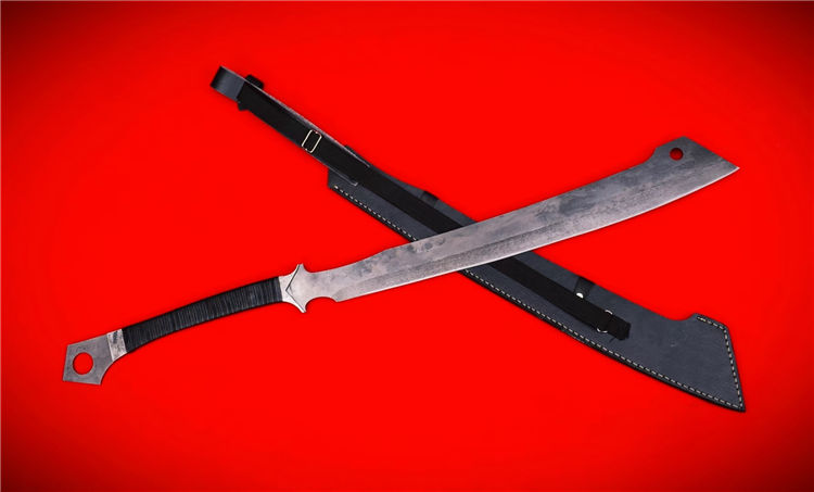 末日废土掠夺者砍刀 全长:95.5cm 刃长:56cm 刃材:65锰钢 手柄:缠皮绳 pu皮鞘,性能强悍