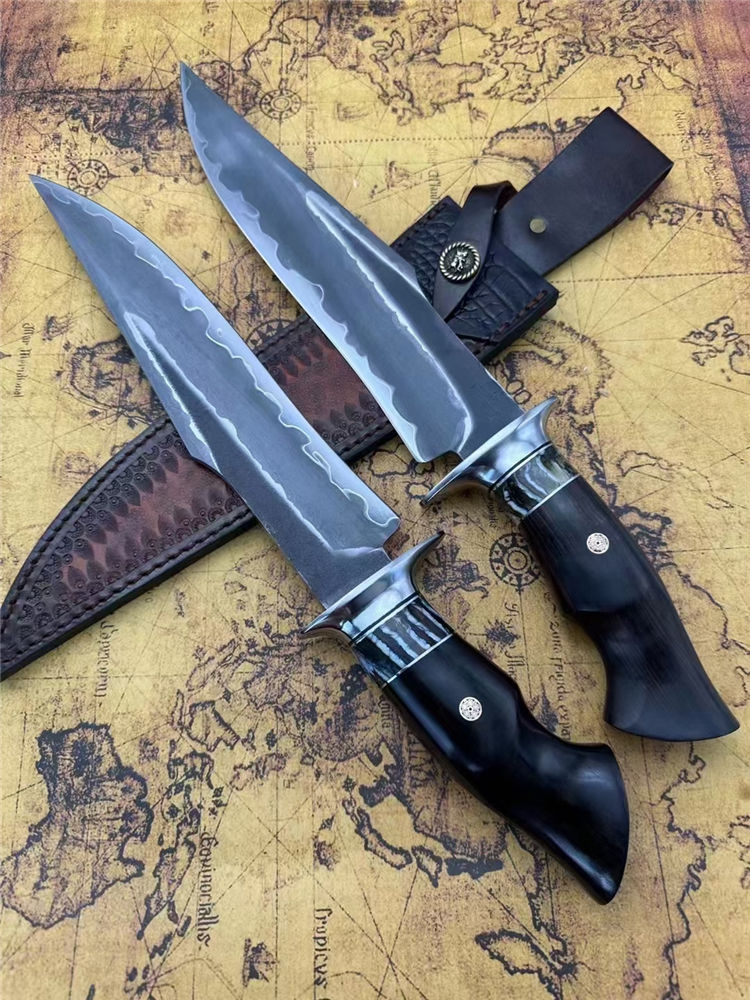 云煅博弈直刀 总长:41cm 刃长:27cm 柄长:14cm 宽度:5CM 刃厚:0.7cm 钢材:日本进口SKD11复合钢 柄材:万能猛犸象臼齿+老料紫光檀木 硬度:钢芯62HRC表面硬度58 重量:580g 热处理:真空深冷热处理 表面效果:俄罗斯云煅工艺 护手:440不锈钢电脑CNC 皮套:意大利进口手工雕花手工缝线植鞣皮