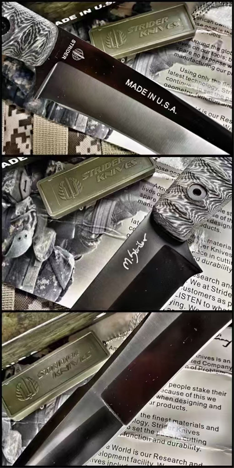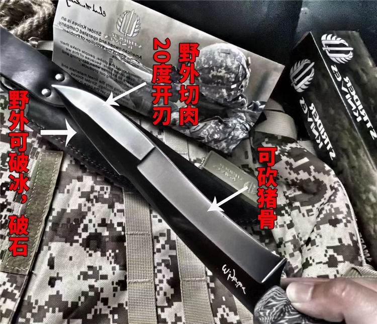 挺进者Strider Knives直刀 总长:35cm 刃长:23cm 刃厚:7mm 刃宽:3.4cm 钢材:进口A8模具钢 硬度:60HRC热处理 配备牛皮套,磨刀石,迷彩盒装:黑色手工盒子