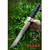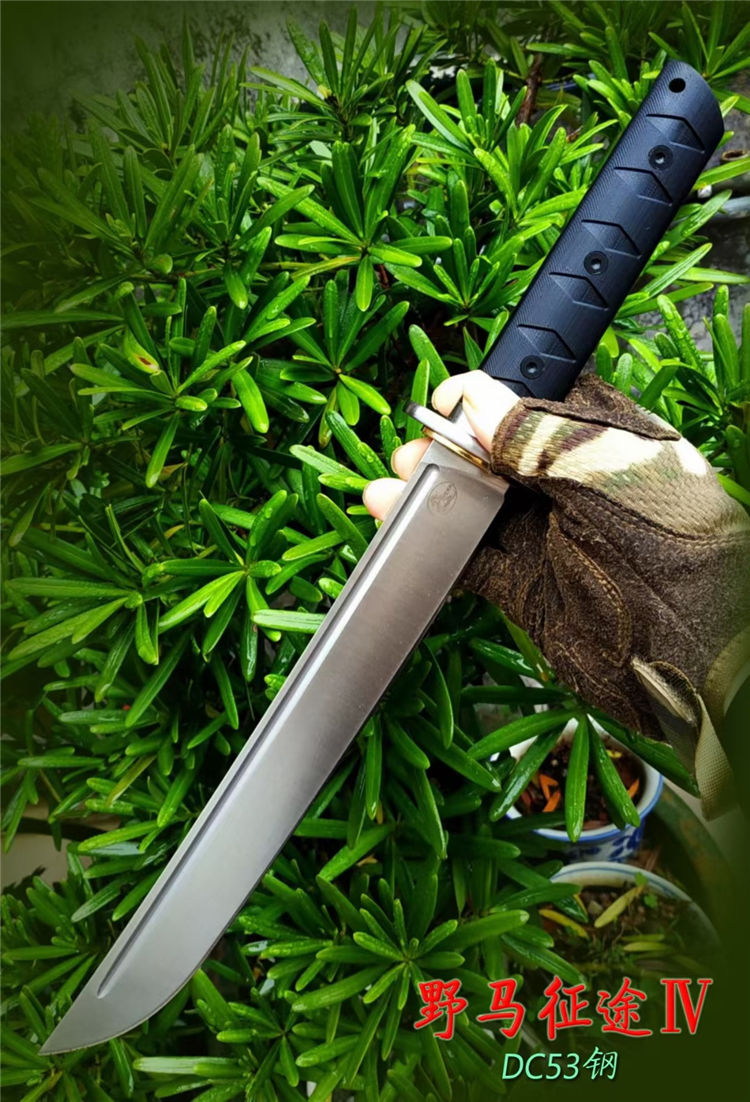 野马征途Ⅳ直刀 全长:42.8cm 刃长:28.2cm 柄长:14cm 刃宽:3.5cm 刃厚:6.2cm 刃材:DC53磨具钢 柄材:G10 硬度:真空处理60-61HRC 重量:480克 刀套:K鞘