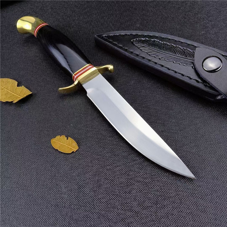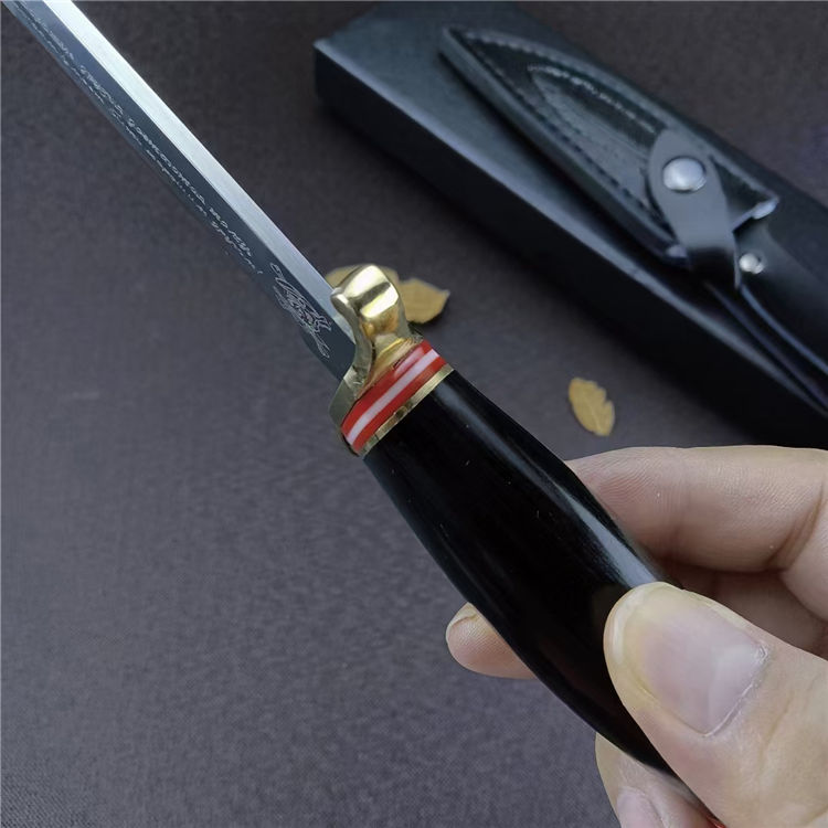 新版俄罗斯契卡直刀 总长:23CM 刃长:12CM 刃宽:2.2CM 刃厚:3MM 刃材:440C 柄材:黄铜+黑檀木 柄长:11CM 柄宽:25MM 柄厚:21MM 重量:155G