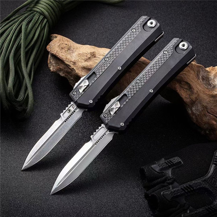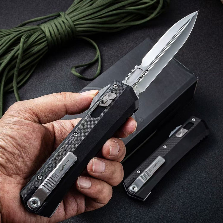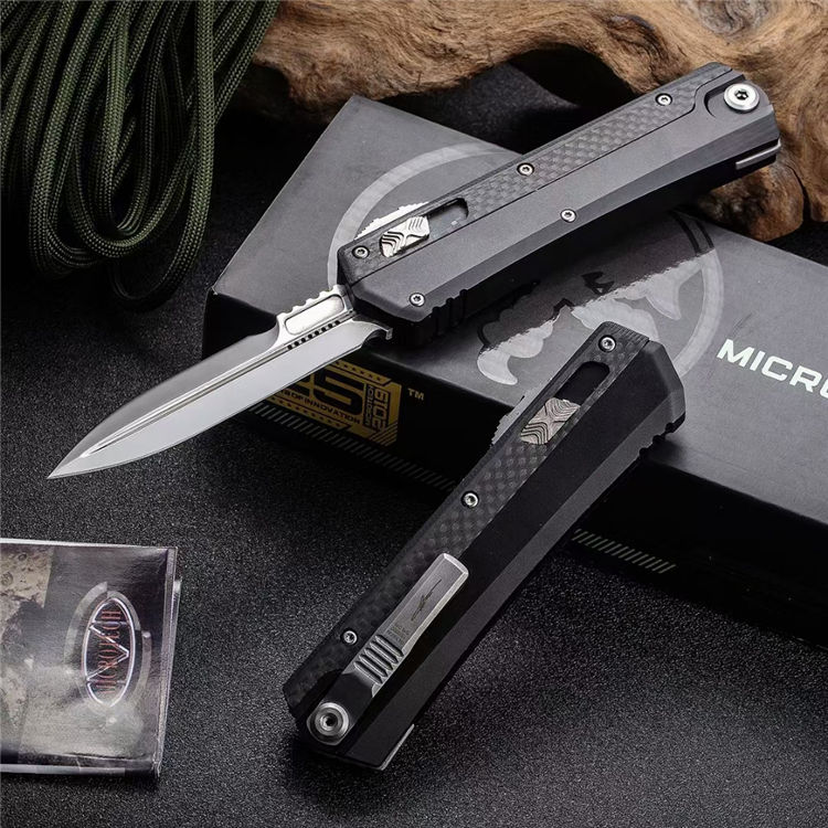 微技术碳钎版蛇神直出跳刀 总长:215mm 刃长:89mm 柄长:133mm 刃厚:3.6mm 刃材:D2高速钢 柄材:T6061航空铝材 硬度:58-60HRC 刃工艺:数控机床水磨处理 柄工艺:二次手工镜面 机制:自动直线跳出+自动收刃产品 总重量:135.5g 产品描述:任何一个有过作战经验的人都知道战争中减轻不必要的重量可以提高灵活作战机动性,外贸款式机加工几乎都来自CNC数控机床,所有配件精确到丝公差位,搭配米花螺丝及专用礼盒套装