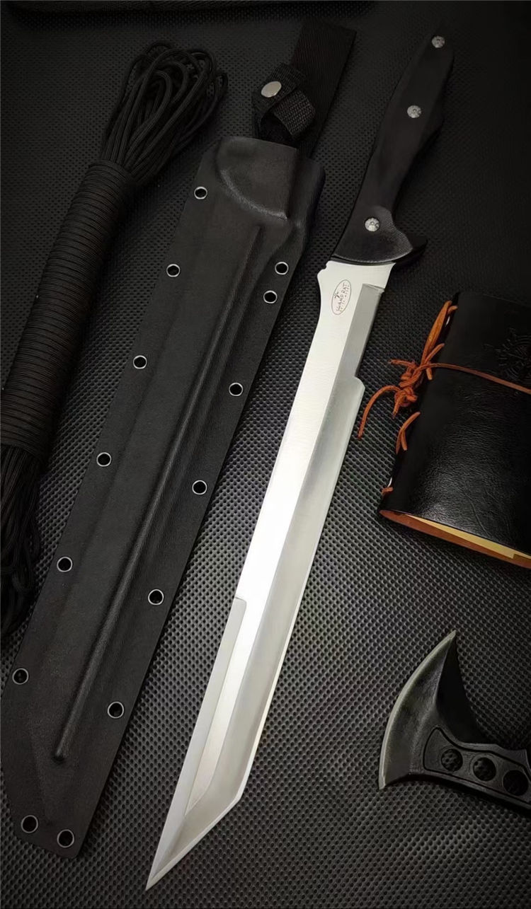 沼泽鼠御龙开山砍刀 全长:575mm 刃长:380mm 柄长:200mm 刃宽:33mm 刃厚:5.4mm 刃材:DC53钢 刀重:815g 净重:1010g含刀鞘 毛量:1330g(含K鞘包装盒) 硬度:60+HRC 表面:数控精磨+砂光拉丝面 柄材:高密度G10手柄 结构:一体龙骨成型 配套:配ABS玻纤加硬-K鞘 包装:黑色礼盒