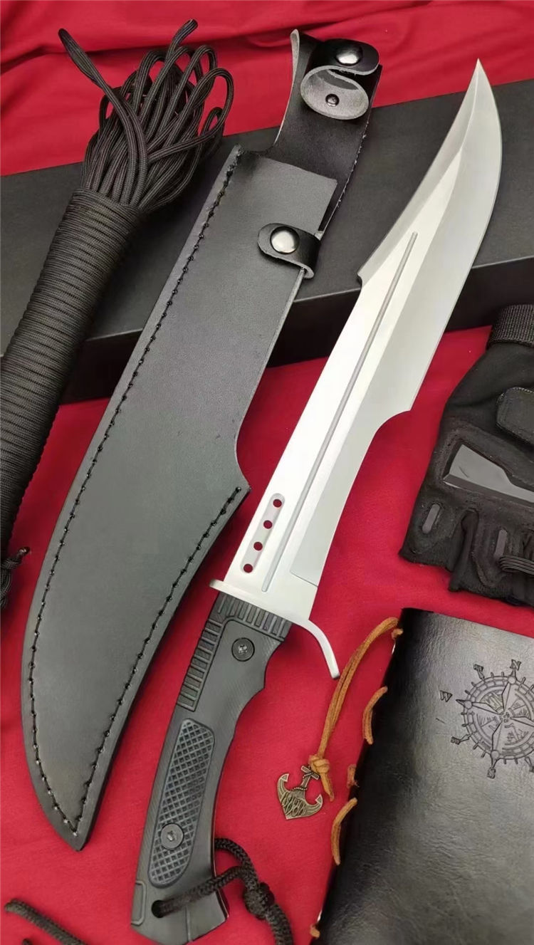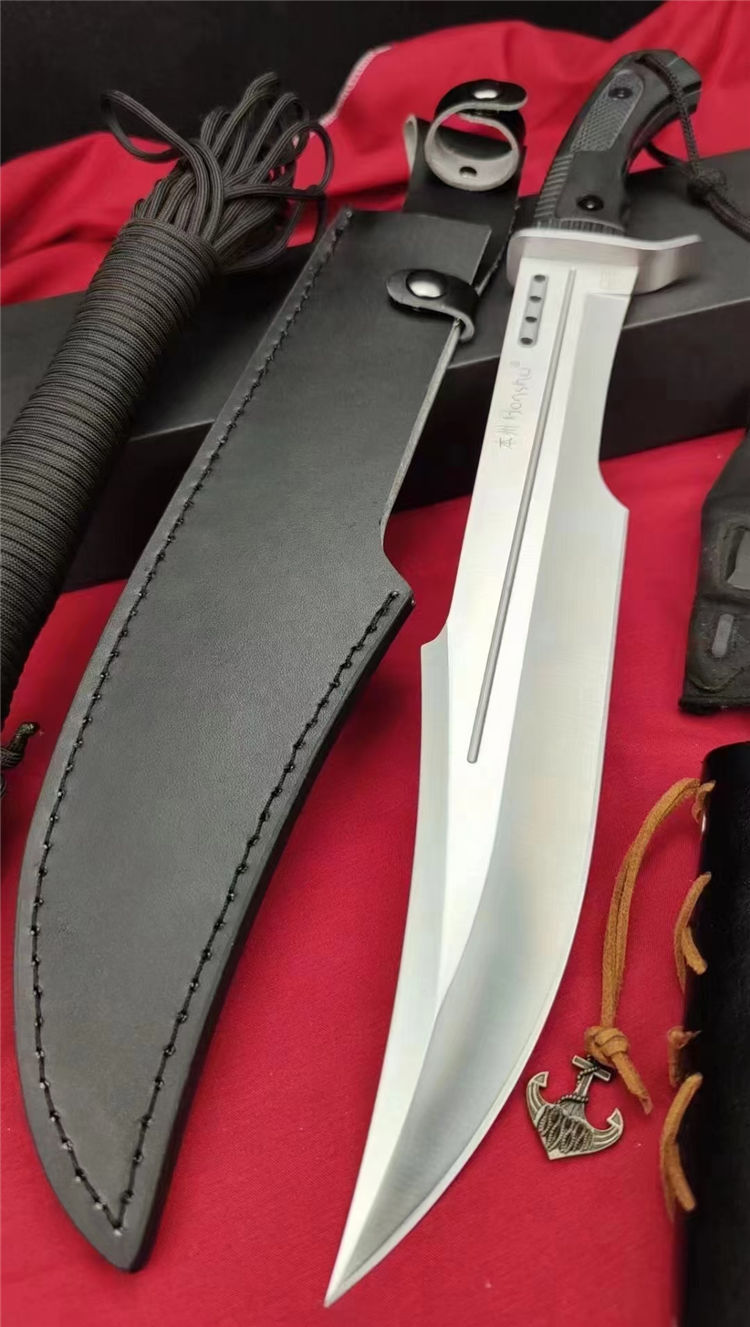 本州风暴开山砍刀 全长:460mm 刃长:210mm开刃处 刃片:32cm 柄长:140mm 刃宽:52mm最宽处 刃厚:5.6mm 刃材:进口D2 高速钢 刀重:663g/769(含鞘) 毛重:1184g含包装 硬度:60±HRC 表面:数控水磨+纳米黑钛氧化涂层 柄材:人体工学高性能尼龙玻纤TPR材料 结构:一体龙骨 配套:手工皮套 包装:黑色包装盒