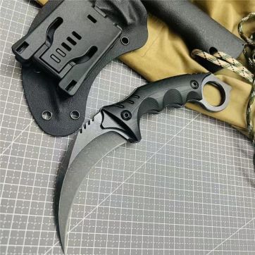 大捷龙爪刀 全长:22CM 刃长:10CM 刃材:AUS-8 硬度:59-60HRC 刃厚:5MM 表面:沧桑石洗 净重:242g 毛重:300g 刀鞘:K鞘