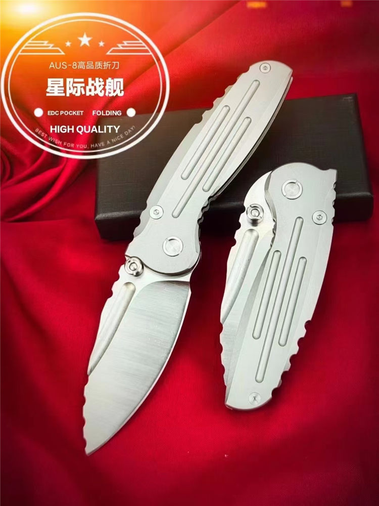 星际战舰折刀 全长:170mm 刃长:72mm 折合:98mm 刃宽:30mm最宽处 刃厚:3.5mm 刃材:进口AUS-8高端钢 刀重:172g 毛量:194g(含鞘包装盒) 硬度:59-61+HRC 表面:纳米陶瓷滚珠喷砂 柄材:全钢CNC精密加工雕刻沟槽+全钢龙骨 结构:双黄铜滚珠轴承 包装:黑礼盒