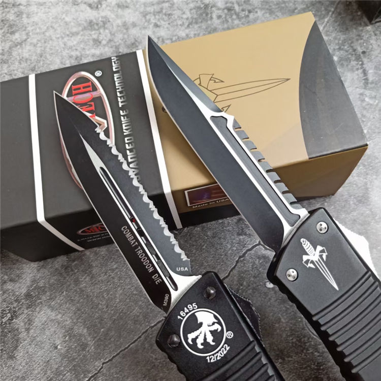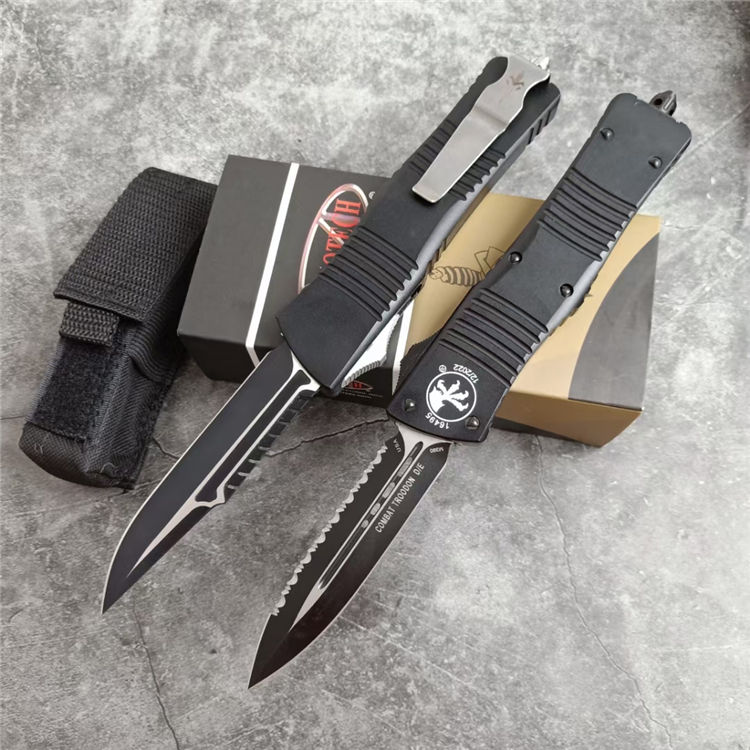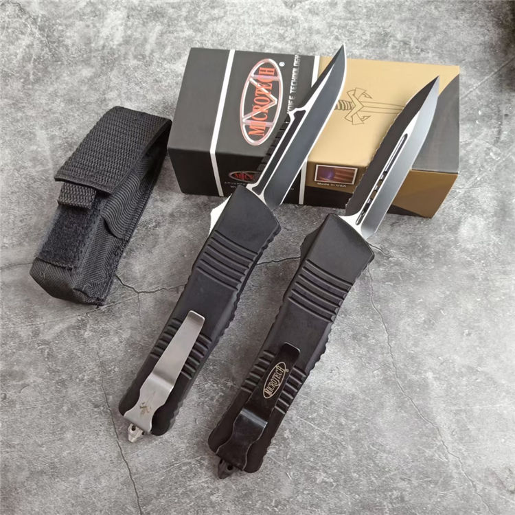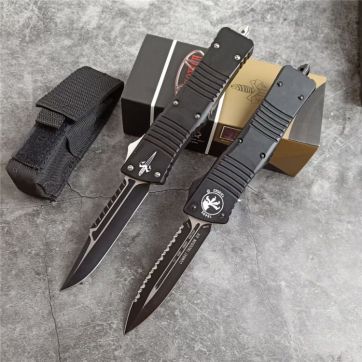 微技术A121拦截者直出跳刀 全长:24CM 刃长:9.6CM 柄长:14.4CM 刃材:D2 硬度:59 表面:镀钛,CNC磨 材料:铝合金 刀鞘:战术尼龙套