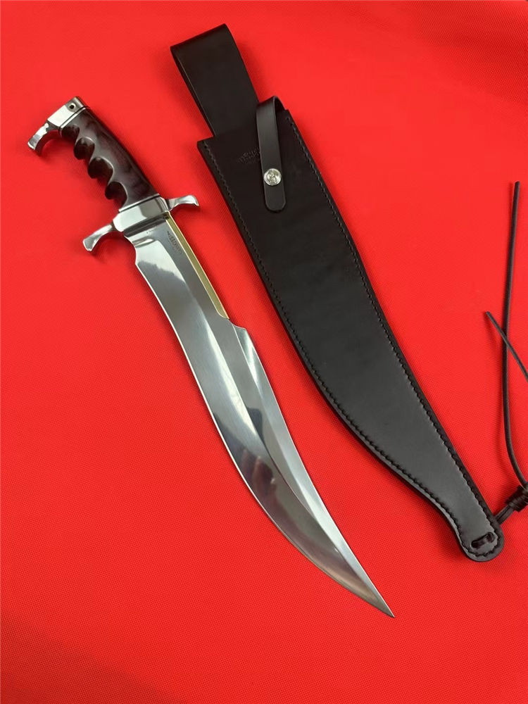 敢死队吉尔大博伊直刀 总长:52CM 刃长:38.5CM 刃宽:5.8CM 刃厚:6MM 柄长:13.5CM 柄宽:25MM 柄厚:14MM 重量:767克 刀鞘:优质牛皮鞘