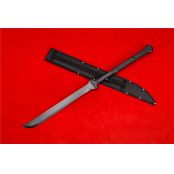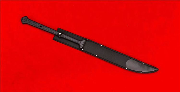大气磅礴,这款剑似乎可以赋予你力量,带你感受不一样的世界。50厘米长的锋利刀身由1065碳钢制成,表面为黑色硬质涂层。手柄由尼龙纤维制成,非常坚固,尼龙护套和肩带可以轻松携带