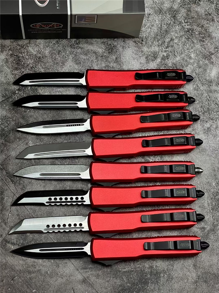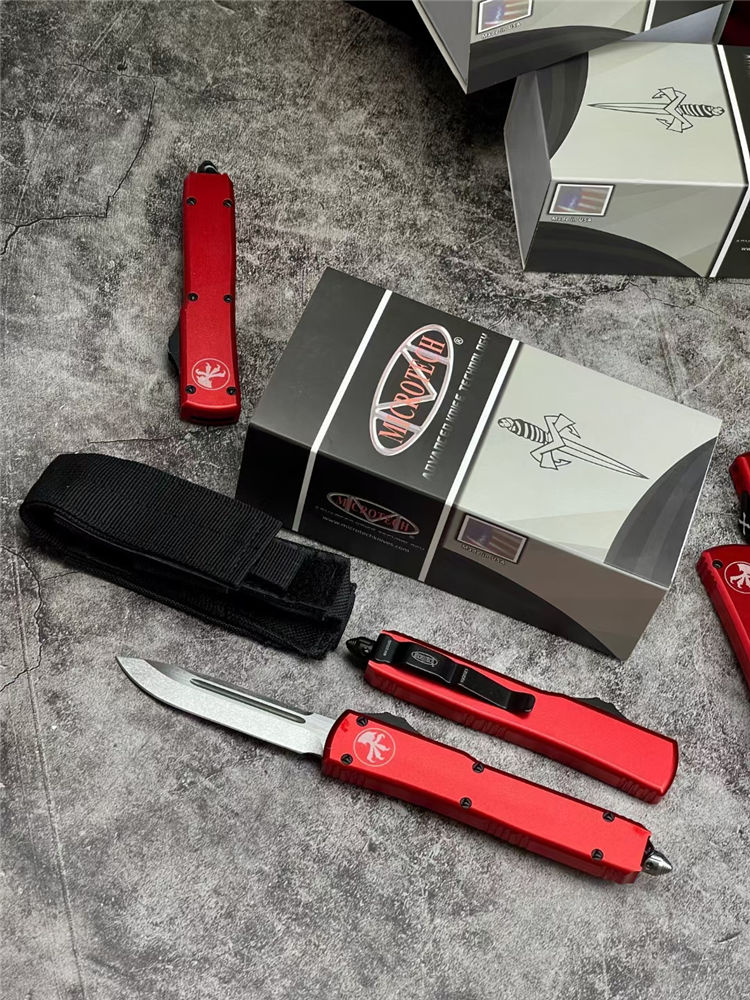 微技术UT85蕉红直出跳刀 总长:22.5CM 刃长:8.5CM 厚度:3MM 刃材:D2钢 硬度:59HRC 锁类:按钮锁 柄材:铝合金 净重:107克 包装:彩盒刀套 附件:尼龙套,彩盒,送拆工刀具