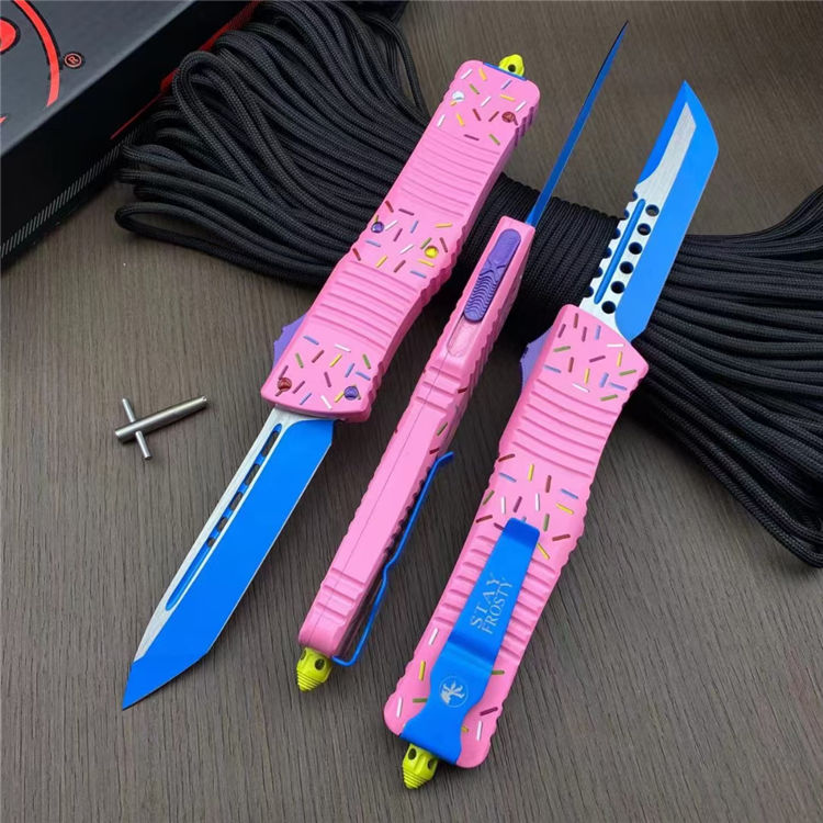 微技术甜甜圈大龙直出跳刀 全长:24cm 刃长:9.5cm 刃厚:3mm 刃宽:2cm 柄长:14.5cm(含尾椎) 刃材:D2 硬度:58-60HRC 总重:(含包装) 裸重:130g 表面:镀钛 柄材:航空铝 包装:彩盒、说明书,尼龙套 备注:带玻璃锥、腰夹