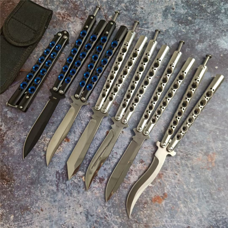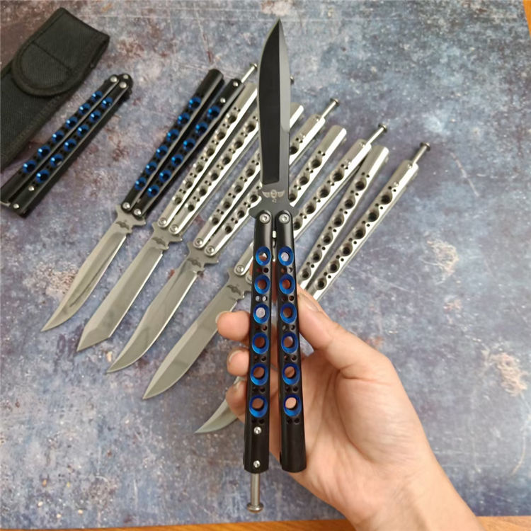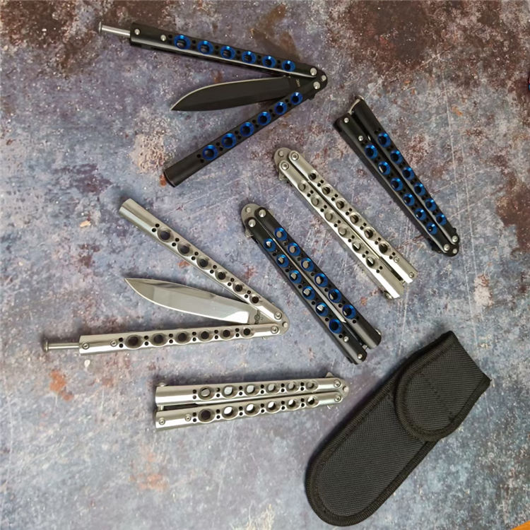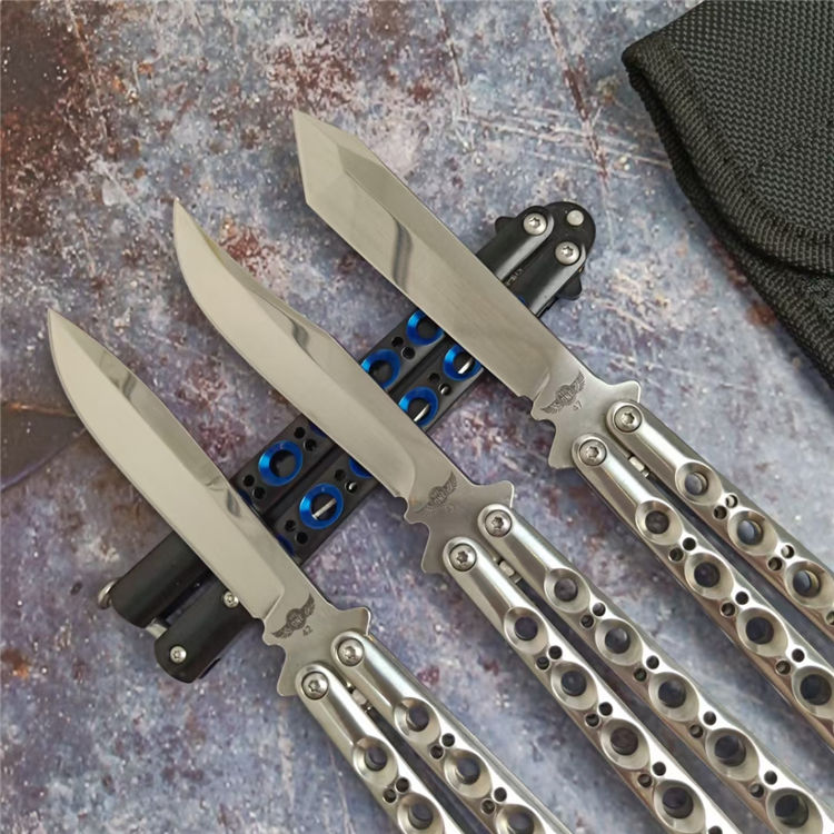 THE ONE镜面款BM系列蝴蝶甩刀 全长:24CM(打开) 刃长:9.5CM 刃厚:0.3CM 刃材:440C 硬度:59 重量:150克 刀鞘:刺绣尼龙刀鞘 铸钢柄镂空,压弹出刀