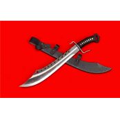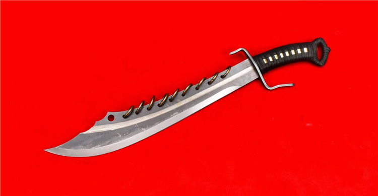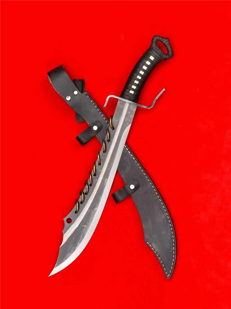 九环小砍刀 全长:54.5cm 刃长:39.5cm 刃宽:7cm 刃厚:5mm 刃材:高锰钢 开槽研磨,PU皮鞘