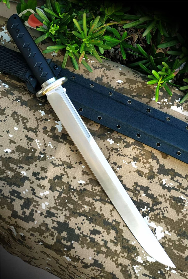 野马侠客武士直刀 全长:51.3cm 刃长:36.3cm 柄长:14.5cm 刃厚:0.65cm 刃宽:3.4cm 刃材:DC53磨具钢 表面:砂光 硬度:60-61HRC 柄材:G10 配件:K鞘 重量:850g含鞘重