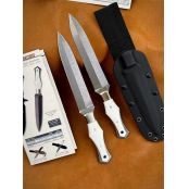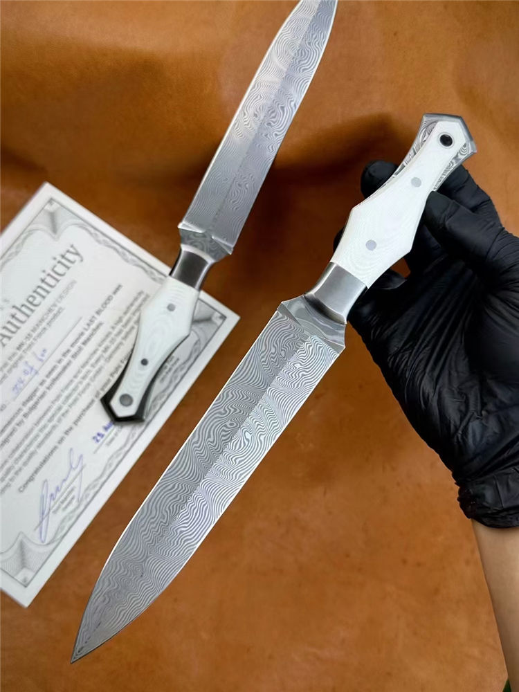 大马士革波尔武力MK10直刀 总长:280mm 刃长:164mm 刃厚:4mm 重量:185克 材钢:大马士革大玫瑰纹 硬度:60-61HR 手柄:G-10/爱德尔斯塔尔 刀鞘:Kydex®-带适配器(适合腰带宽达55mm)套装包含 配件:MK-10最后的血Kydex®-剪纸,收藏袋,照片