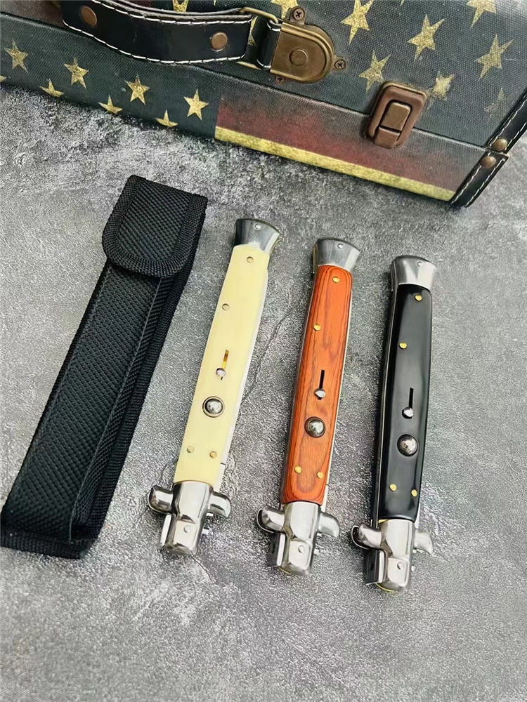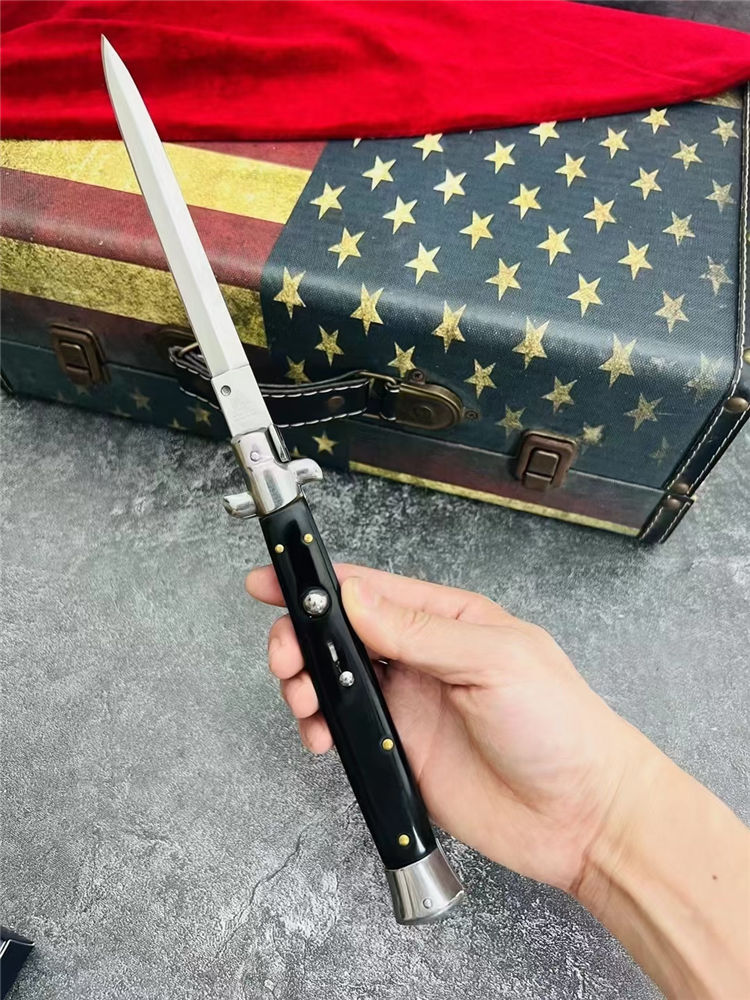 13寸黑手党跳刀 全长:33.1CM 刃长:14.8CM 刃宽:1.5CM 刃材:440C 刃厚:3MM 柄长:18.3CM 柄材:彩木柄,黑色树脂柄,白色树脂柄 净重:172G
