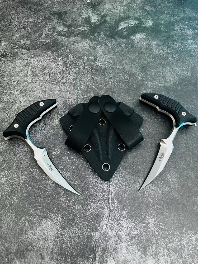 微技术双鞘版蜜蜂手刺 全长:11.2cm 刃厚:4mm 刃长:6.2cm 刃宽:1.4cm(最宽处) 柄厚:2.2cm 柄长:7.4cm 材质:918钢 净重:77g 全重:115g 两种搭配方式可选:(全刃+全刃)(全刃+全齿)