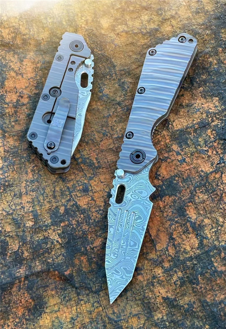 挺进者SMF三叉戟折刀 总长:22CM 刃长:7.5CM 刃厚:6MM 刃宽:3.5CM 钢材:公司提供手工锻造VG10大马士革钢(110层) 热处理:专业真空深冷热处理 硬度:60-61HRC 表面:锻造扭绞大马纹 重量:207G 柄材:TC4钛合金双面烧钛,低骨与背夹子都采用TC4钛烧刃 包装:高密度专业防水盒子