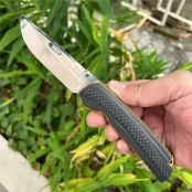 花田洋肥后2折刀 全长:21mm 刃长:90mm 柄长:120mm 刃宽:26mm 刃厚:3.6mm 刃材:VC10(深冷处理) 重量:148g 硬度:59-60HRC 表面:拉丝/镜光 柄材:TC4钛合金+炭纤维 刀夹:TC4钛合金 结构:陶瓷轴承垫片 其他:防水盒