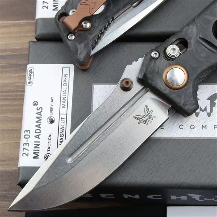 蝴蝶273-03碳纤维折刀 总长:19.3cm 刃长:8.3cm 柄长:11cm 钢材:440c 厚度:3.2mm 硬度:58HRC 重量:107克 柄材:碳纤维+钢 包装:彩盒