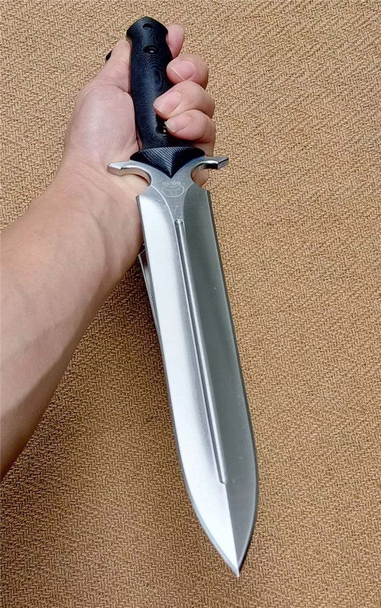 博尔特冰锋2直刀 全长:367mm 刃长:227mm 柄长:140mm 刃宽:40mm 刃厚:5.9-6.0mm 刃面:精细幼砂光钢本色 类型:以锋利度,耐磨韧性保持度最出色 开刃方式:二次开刃 刃材:A8钢 热处理:真空淬油热处理和2次回火处理使钢材韧性保持性更佳 硬度:61+-0.5HRC 柄材:黑色G10+对锁螺丝钉,一体全柄、握感更舒服、性能更强悍 包装:精美黑纸盒+护刀油+伞绳 净重:450克 刀鞘:K鞘+360度旋转夹《少量碳纤维表面鞘可选》