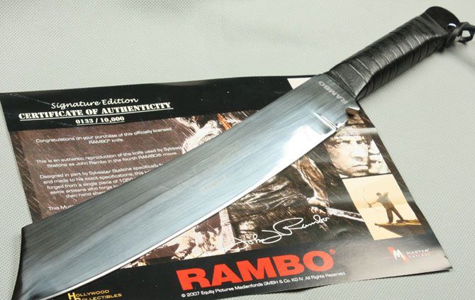 最新兰博4号手签纪念版(白) 全长:49.7cm 刀刃:30cm 刃厚:0.58cm 材料:420J2不锈钢 硬度:57HRC 柄长:16.5cm 净重:890克 毛重:1300克(包含高级金字彩盒和皮套)随附高档真皮刀套,“史泰龙”签名照一张,“出世纸”一张