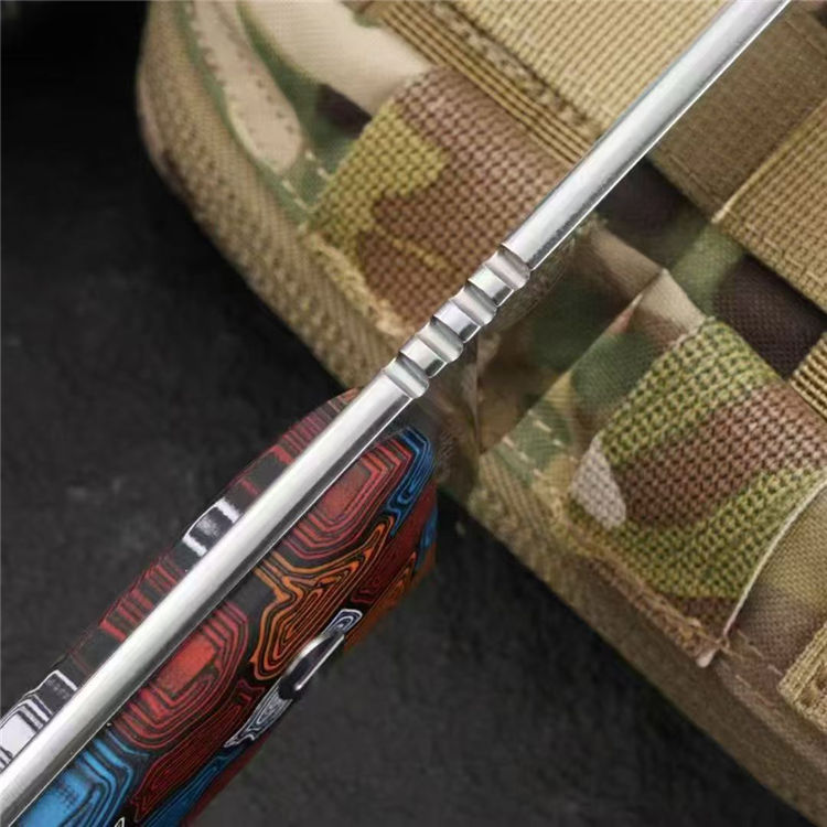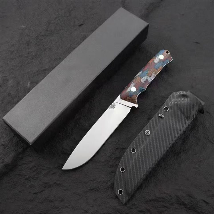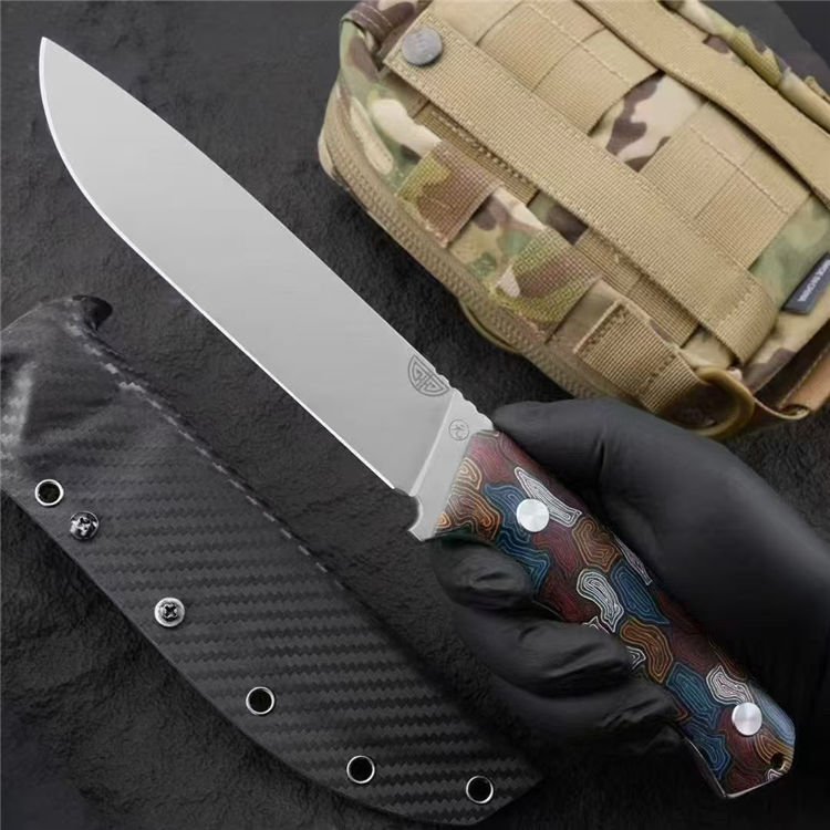 元刃手工直刀 全长:30cm 刃长:15.5cm 刃厚:5.7mm 刃宽:35mm 钢材:进口日本SKH-9高速钢 硬度:62HRC 表面:砂光款 镜面款 柄材:蜂窝彩色G10 刀套:纤维纹K鞘 重量:435克