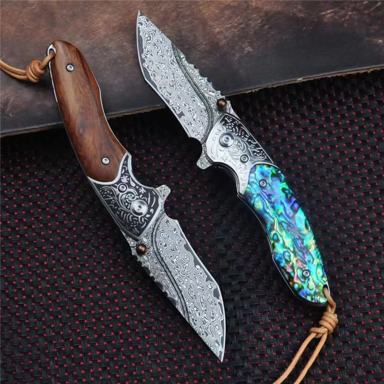 大马士革吉瑪折刀 总长:18cm 刃长:7.3cm 柄长:10.7cm 刃材:多层锻打大马士革钢 柄材:不锈钢+沙铁木/彩贝 结构:滚珠轴承 刃面:酸洗后黑白效果 硬度:60+-1HRC 热处理:真空热处理 重量:122g(裸刀) 包装:礼盒+皮绳
