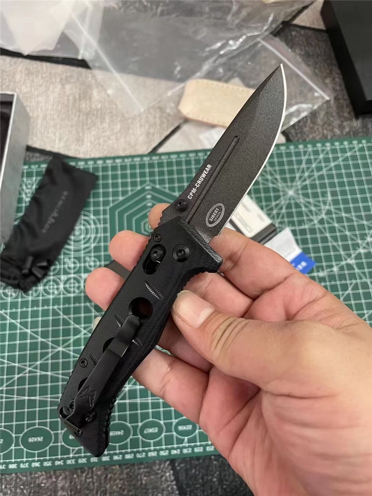 蝴蝶BM273折刀 全长:19.2CM 刃长:8.5CM 柄长:10.7CM 刃宽:28mm(最宽处) 刃厚:3mm 刃材:D2钢 刀重:113克 硬度:58HRC 表面:黑色镀钛/金色 柄材:G10 包装:原装盒子