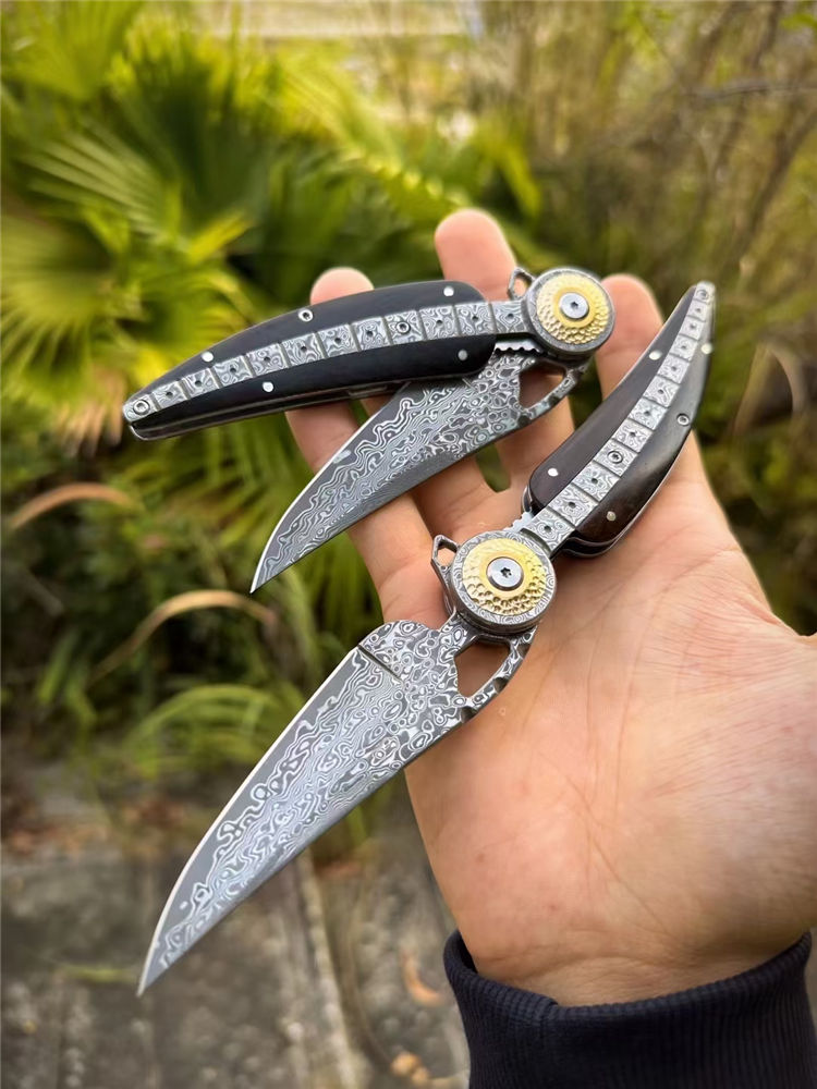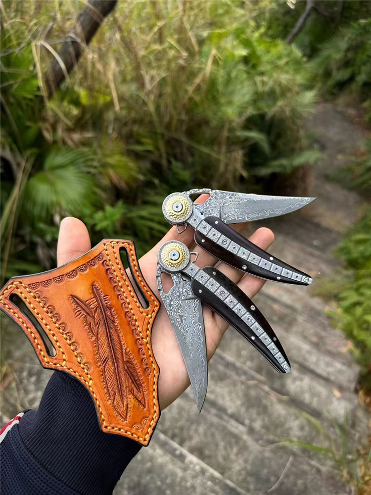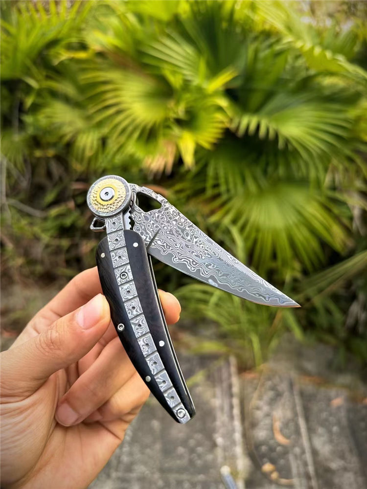 大马士革柳叶折刀 总长:21.2cm 刃长:8.6cm 柄长:12cm 厚度:3MM 宽度:2.7cm 钢材:进口锻造大马士革钢(85层) 硬度:60HRC 热处理:真空热处理 柄材:一体锻造大马士革钢+纯黄铜+黑檀木 重量:145g(净重) 包装:黑色手工盒