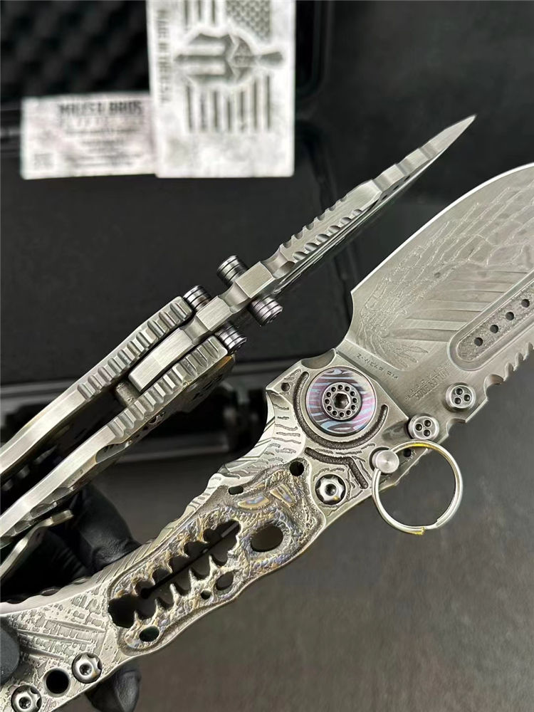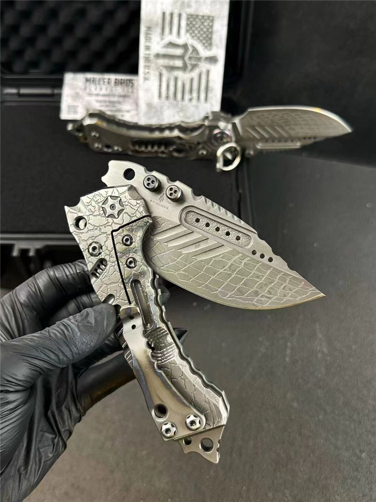 米勒T1侏罗纪折刀 总长:25.5cm 刀刃:10.5cm 手柄:15cm 厚度:6.5MM 宽度:4.7cm 钢材:Z-Wear粉末钢 硬度:63HRC 刀柄:TC4钛合金 +CNC 刀夹:TC4钛合金手工 重量:455g 表面:镀钛发黑石洗做旧 包装:刀具证书+高端防水盒