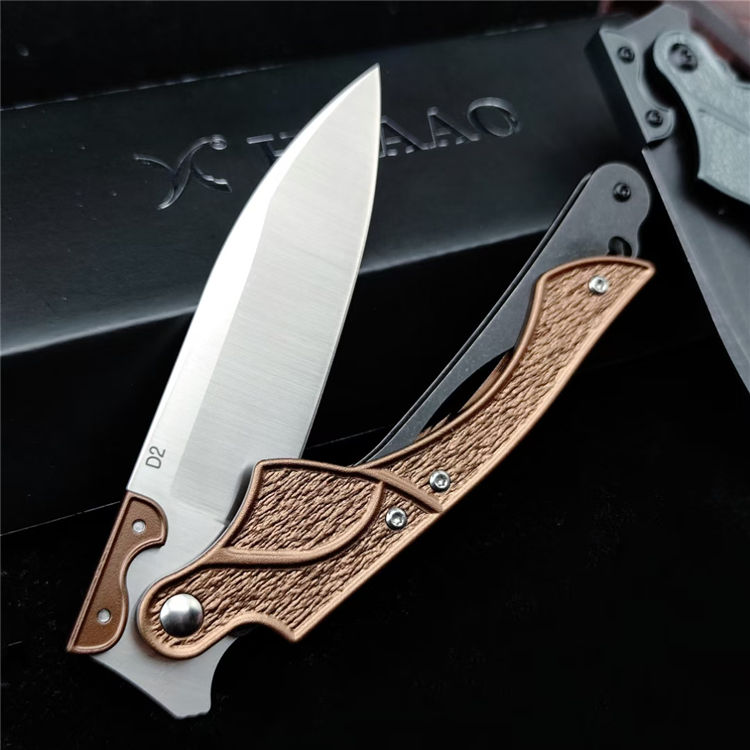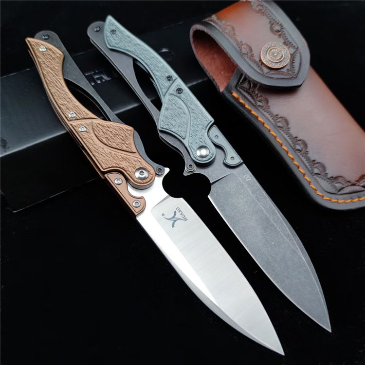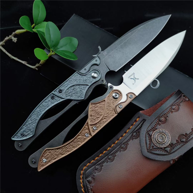 机械鸟折刀 总长:22.5cm 刃长:9.1cm 刃宽:2.6cm 刃厚:2.6mm 材质:D2 柄材:420钢+T6铝 柄长:13.4cm 柄厚:12.4mm 刀鞘:皮鞘 重量:92G
