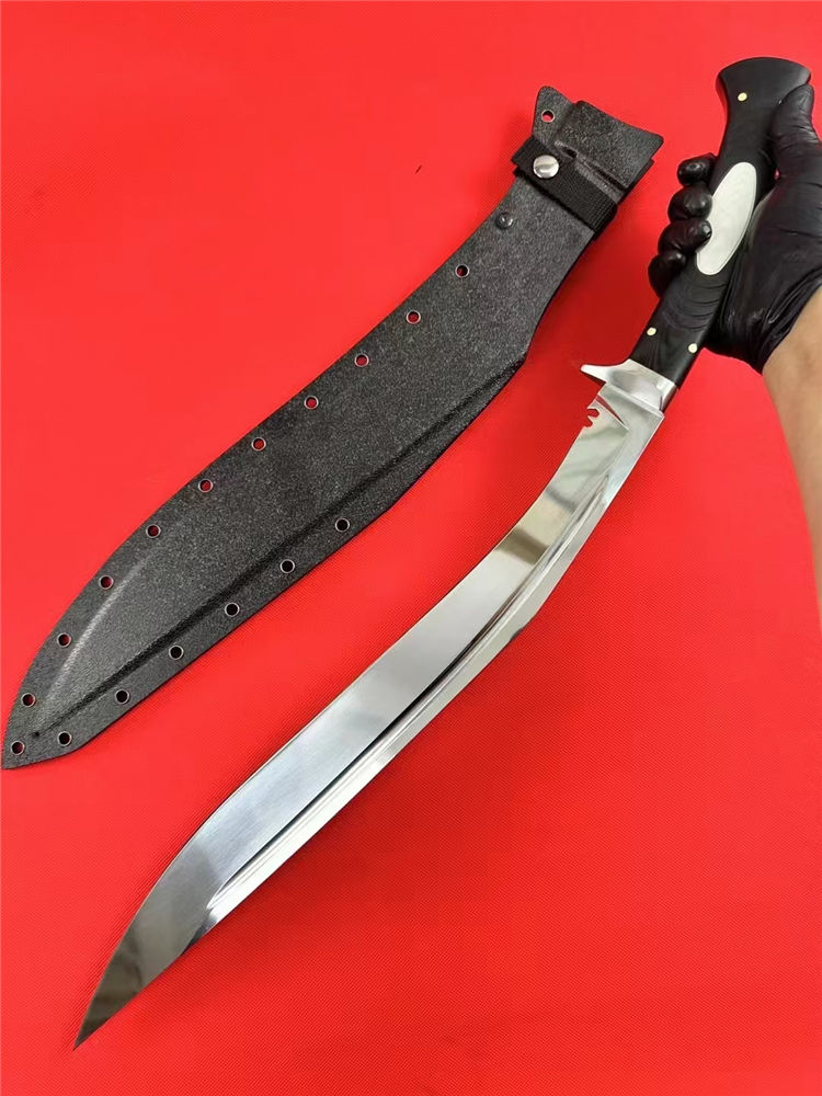 尼泊尔武士狗腿弯刀 全长:67CM 刃长:45CM 刃厚:0.75CM 柄长:21CM 材质:DC53真空热处理 柄材:进口G10 重量:1.25kg含鞘1.5kg 硬度:60-61HRC 刀套:K鞘 柄厚:2.3CM 表面:手工镜光