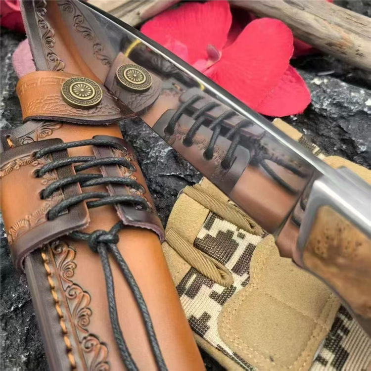 崖柏将军直刀 全长:288mm 刃长:145mm 刃厚:5mm 刃宽:35mm 钢材:CPMS-110 手柄:崖柏木+钢 刀面:超镜面 硬度:60+hrc 重量:390g带套:460g 总重:582g