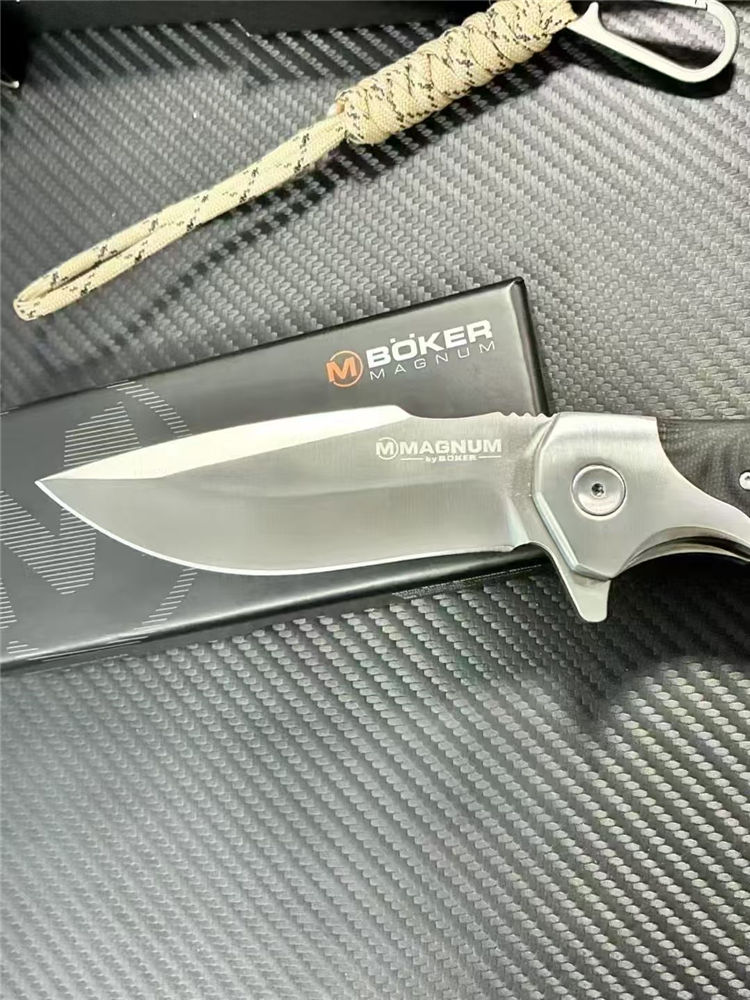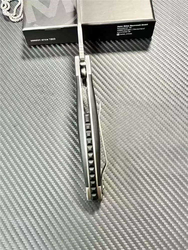 博克大熊折刀 全长:22.5cm 刃长:9.6 cm 闭合:12.5cm 钢材:D2 硬度:60+HRC 刃厚:4mm 刃宽:3.3cm 表面:CNC数控水磨 手柄:全钢抛光+G10 重量:220克