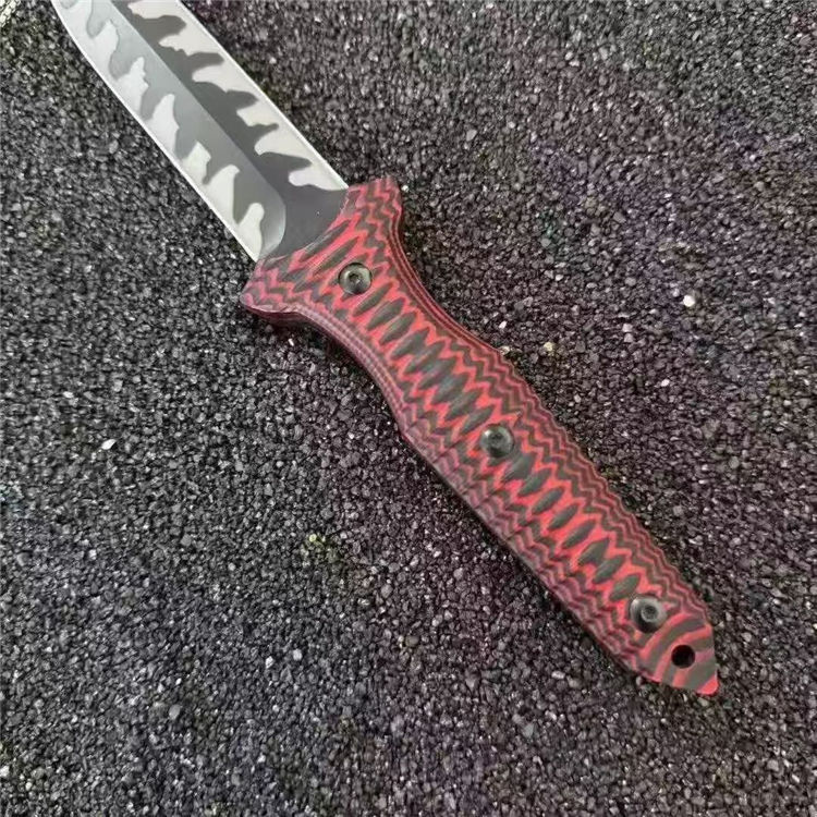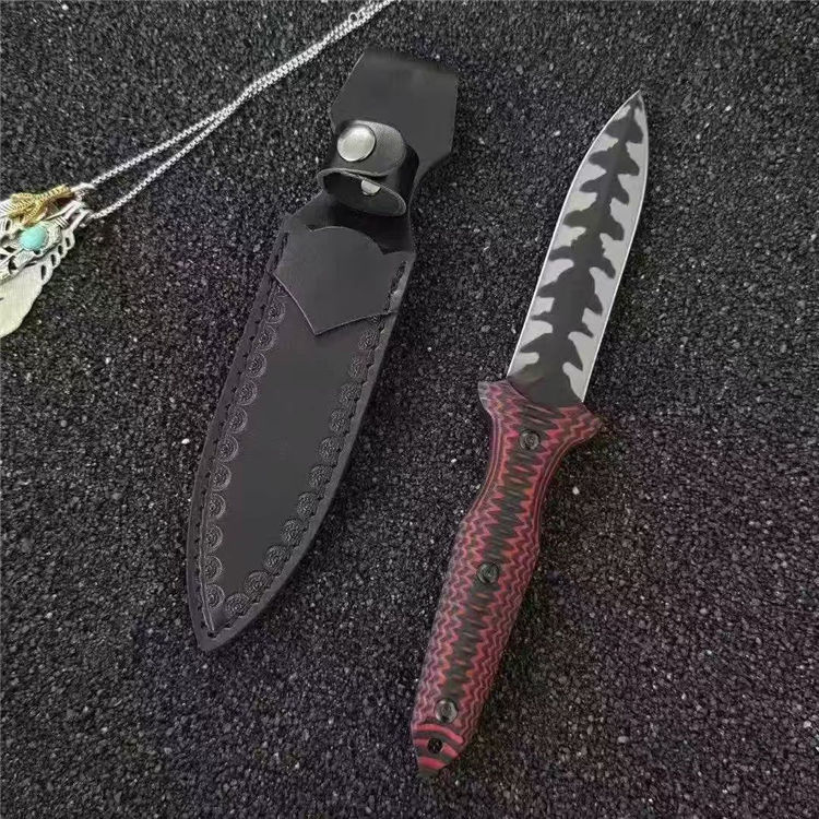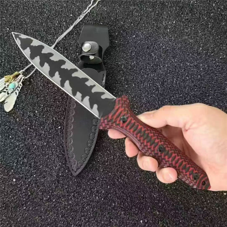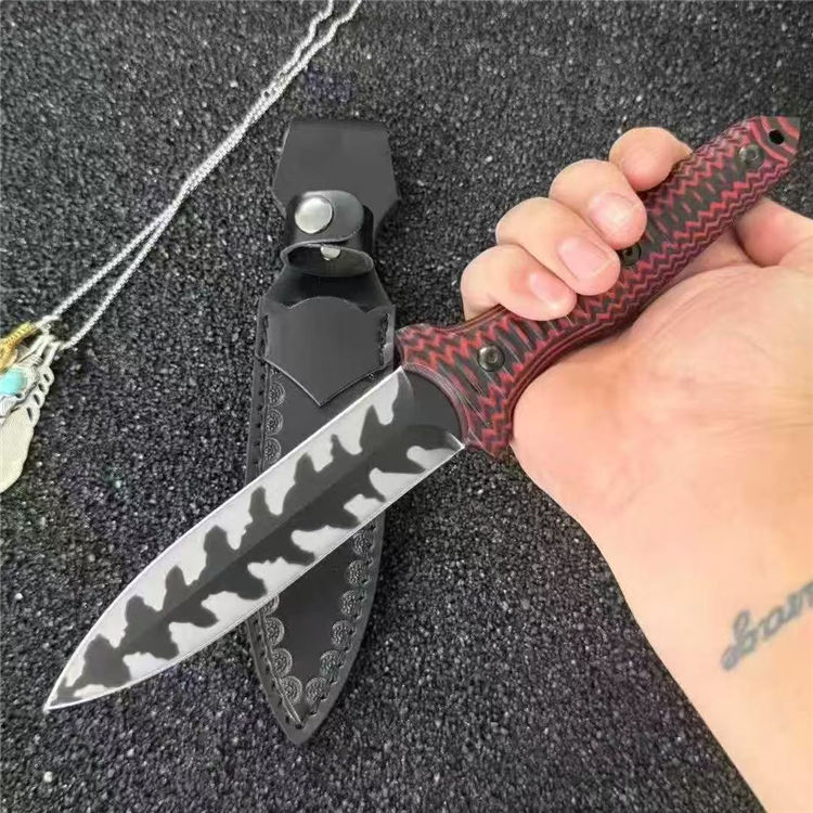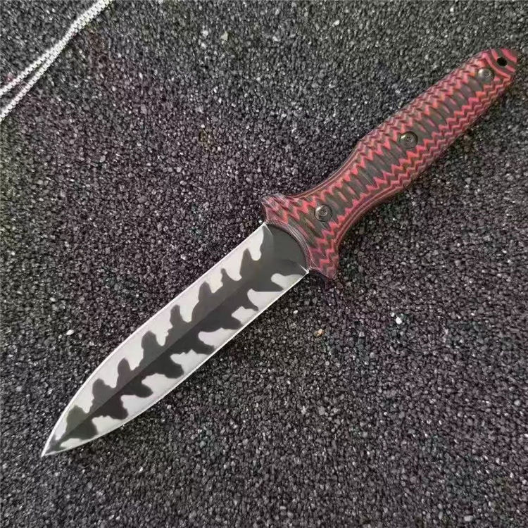 赤兔双刃直刀 全长:28.2cm 刃长:13.8cm 刃厚:4mm 刃宽:3.1cm 钢材:9CR13 柄长:14.4cm 柄材:G10 重量:234g(含套290)