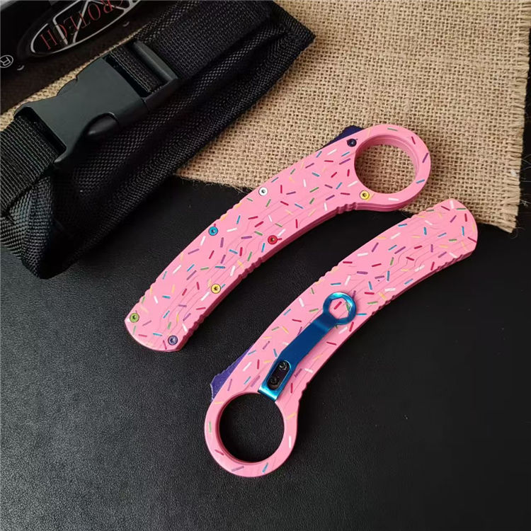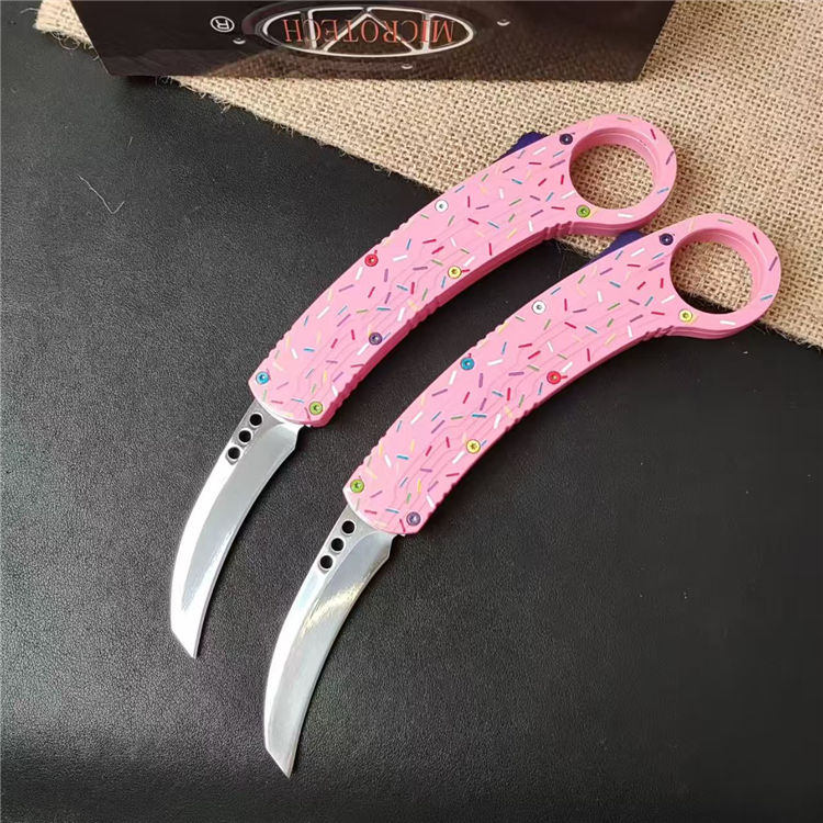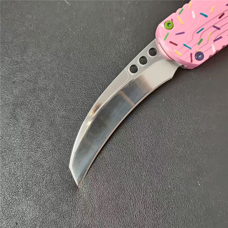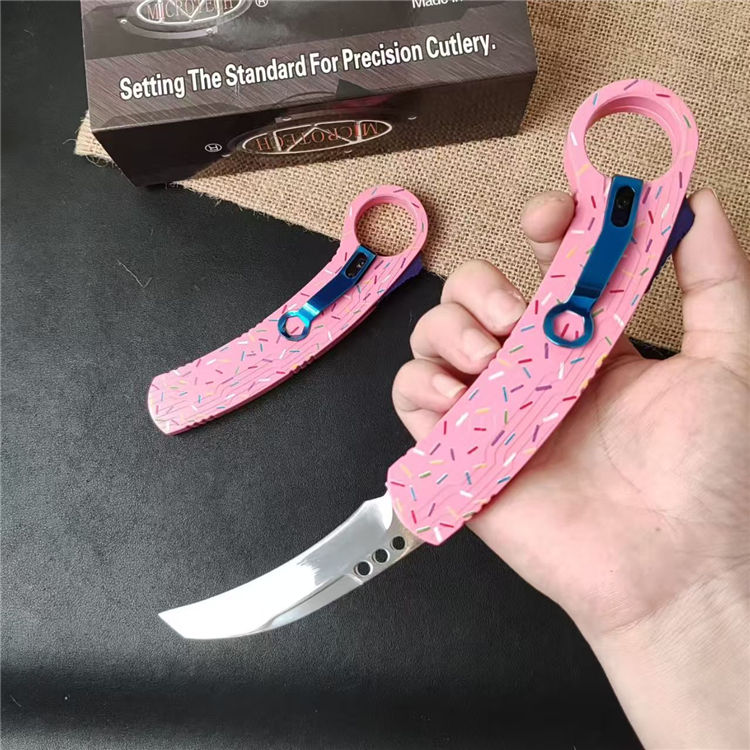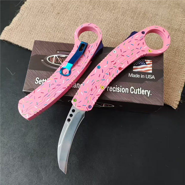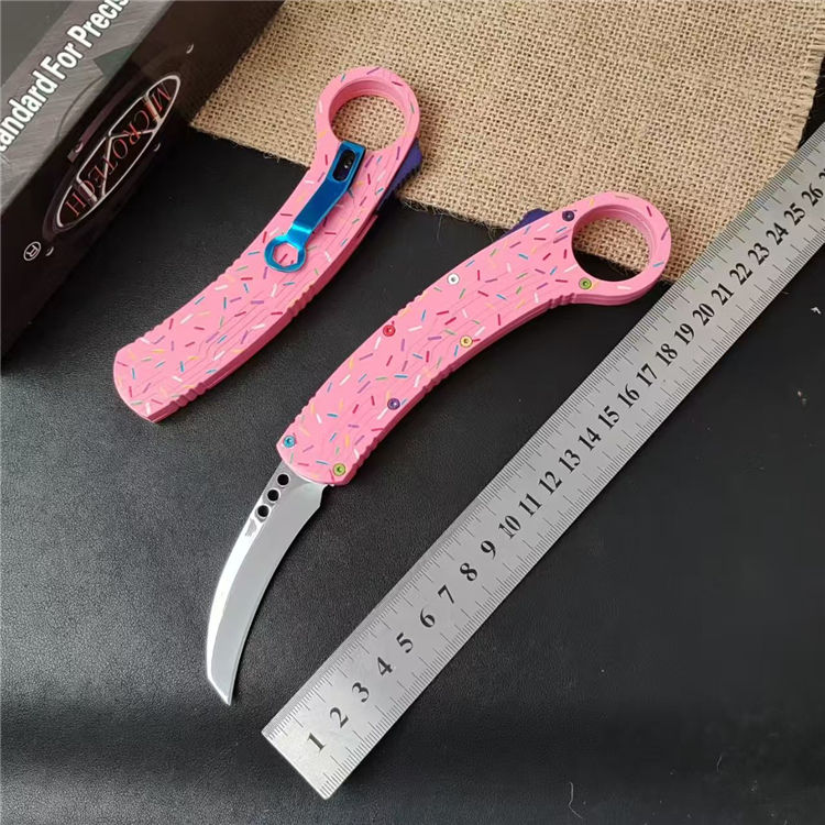 微技术甜甜圈红猛禽爪子跳刀 总长:22.7cm 刃长:8cm 刃宽:1.7cm 刃厚:2.5mm 刃材:440C 柄长:14.7cm 柄材:锌铝合金 柄宽:26mm 柄厚:14.8mm