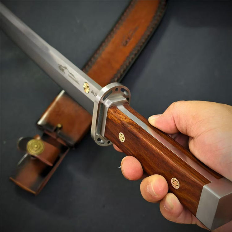 日式行者直刀 全长:44cm 刃长:29cm 柄长:13.3cm 刃宽:3.8cm 刃厚:6mm 钢材:AUS-10 柄材:酸枝木 重量:679g(含皮套810g)