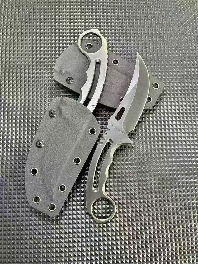 一体异型爪刀 总长:21cm 刃长:9.5cm 刃宽:3cm 刃厚:3.8mm 柄厚:5.8mm 刃材:D2 表面:发黑+黑洗 柄长:11.5CM 重量:131G含包装刀鞘总重量:204G 一体钢CNC精雕成型