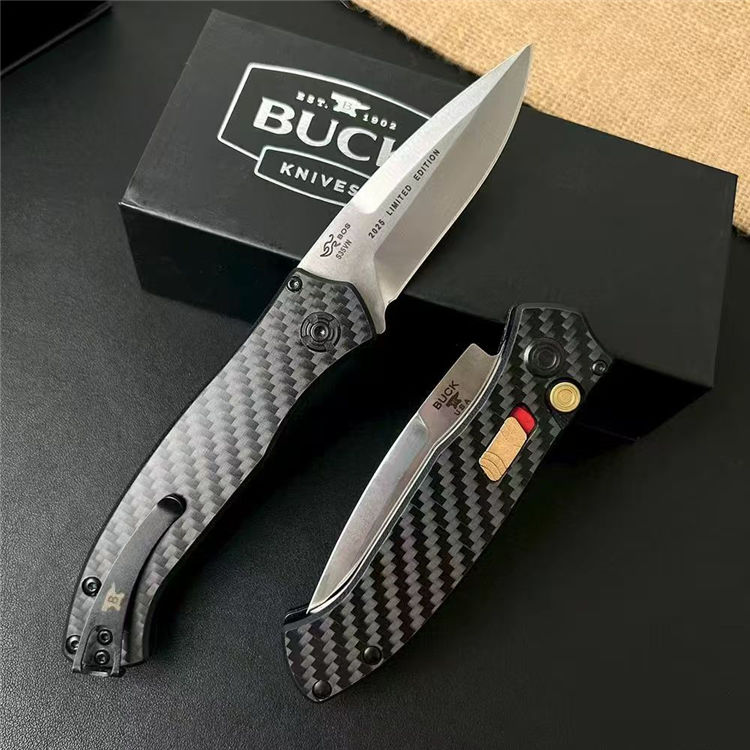 巴克838侧开跳刀 全长:196mm 刃长:80mm 柄长:116mm 刃厚:3mm 宽度:25mm 刃材:S35VN 柄材:碳纤 硬度:60HRC 净重量:125.5克 重量:206g( 含包装)