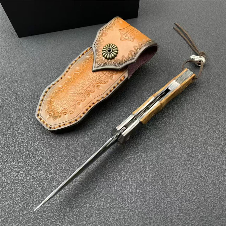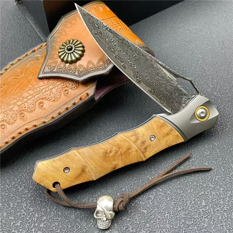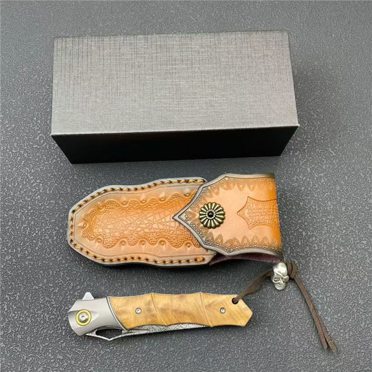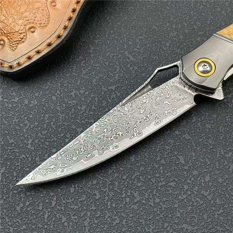 大马士革影武者折刀 全长:21.3cm 刃长:9cm 柄长:12cm 刃宽:2.5cm 刃厚:2.5mm 刃材:大马士革钢 柄材:钢+影木 刀重:118G/163G(含皮套) 毛量:245G 硬度:58-60HRC 包装:皮套+礼盒