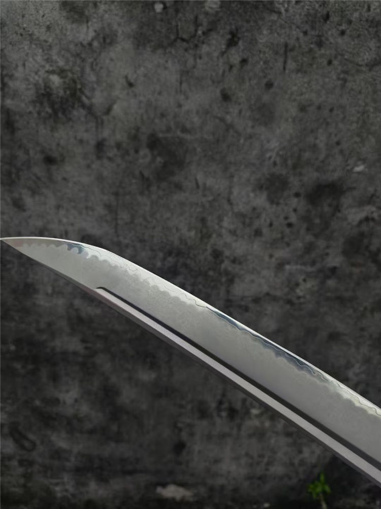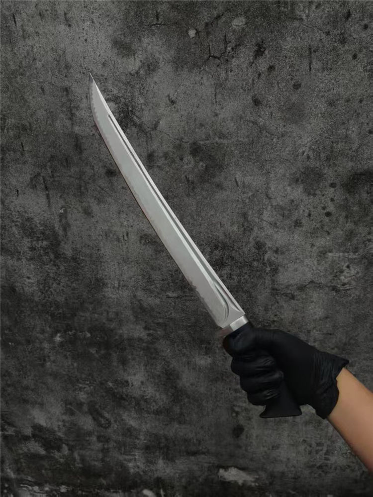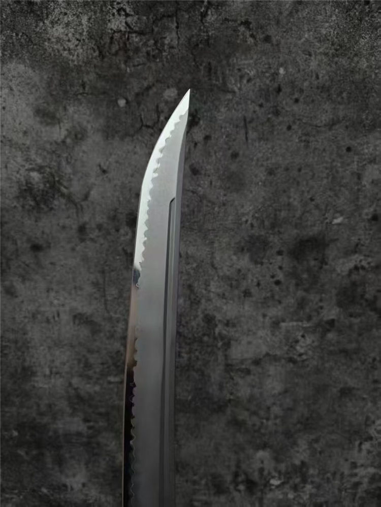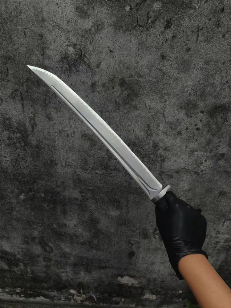 忠战术直刀 全长:555mm 刃长:420mm 厚度:0.6cm 钢材:SKD11 硬度:60HRC 手柄:G10 刀鞘:皮鞘