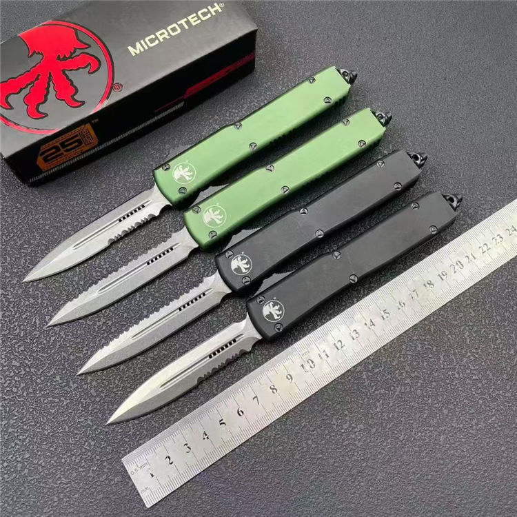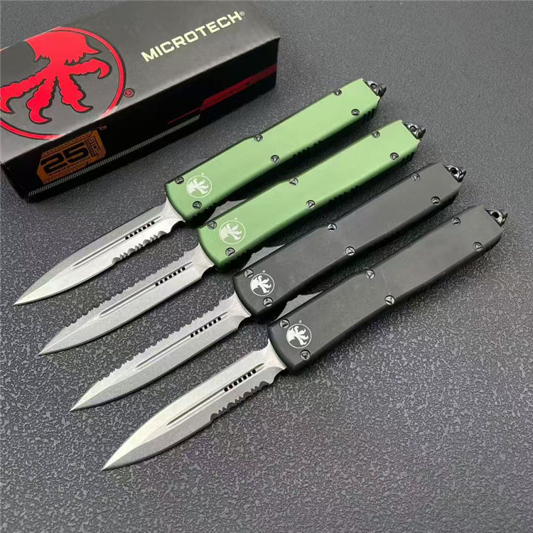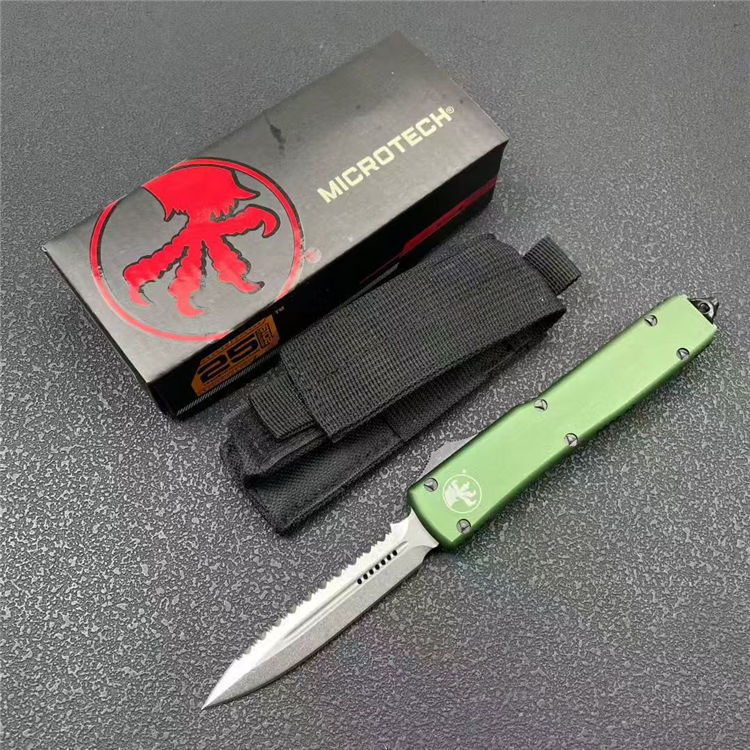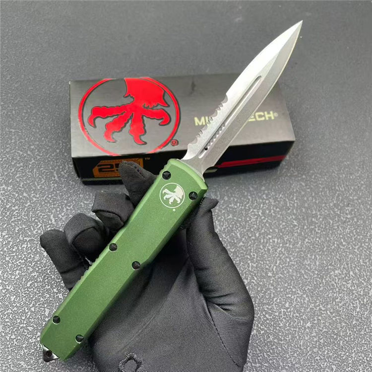 微技术铝合金UT85定制版直出跳刀 全长:22.5cm 刃宽:1.7cm 刃长:8cm 柄长:13.5cm 刃厚:1mm 刃材:7CR14MOV 柄材:铝合金 刀重:105G 毛量:168G 硬度:59-60HRC