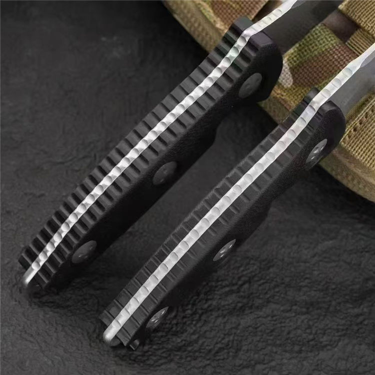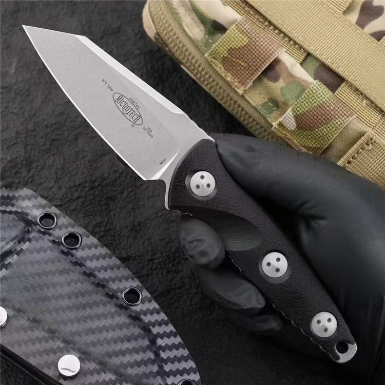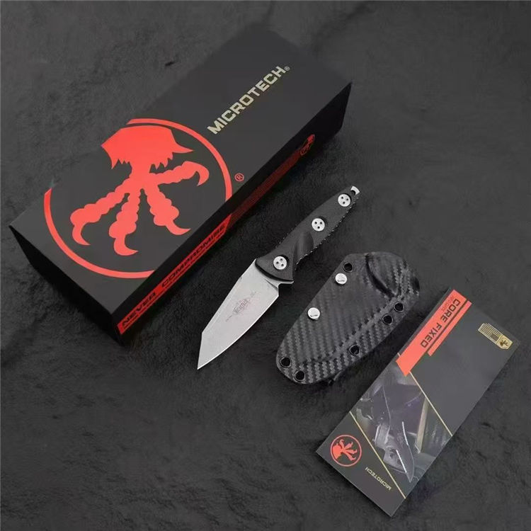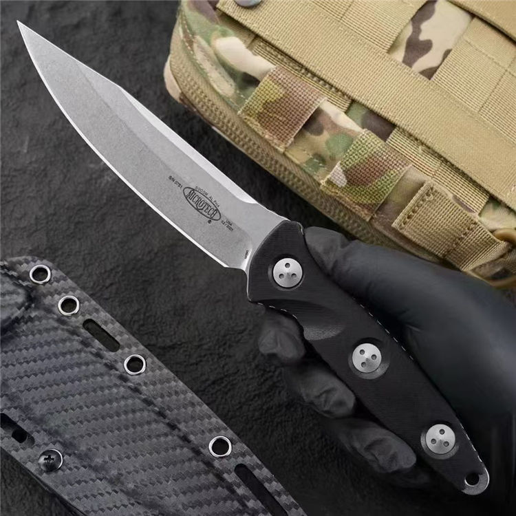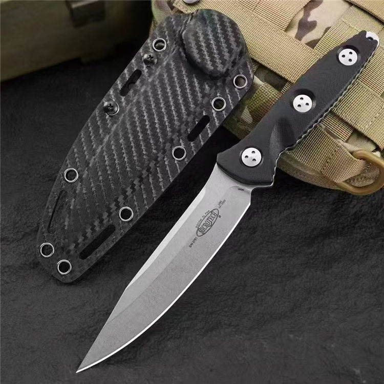美国微技术阿尔法精英直刀 全长:20.75cm 刃长:9.5cm 手柄:黑色G10 厚度:0.4cm 钢材:m390钢 硬度:61HRC 表面:石洗 刃厚:0.42cm 重量:约226克 附件:碳纤维饰面Kydex鞘