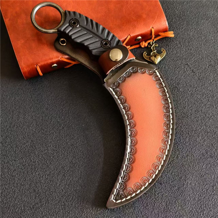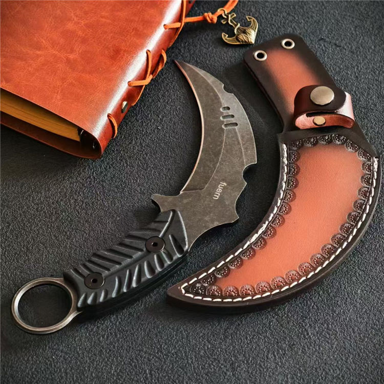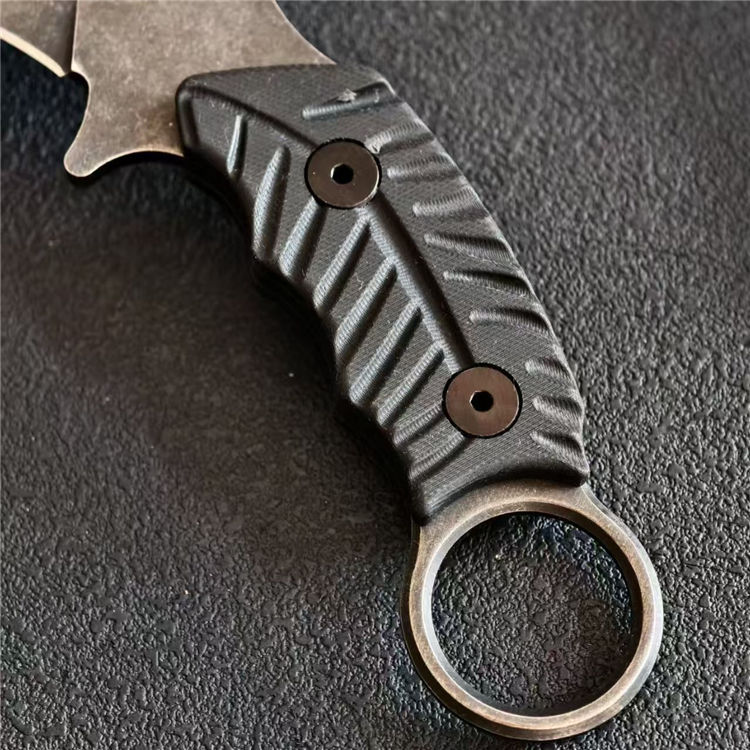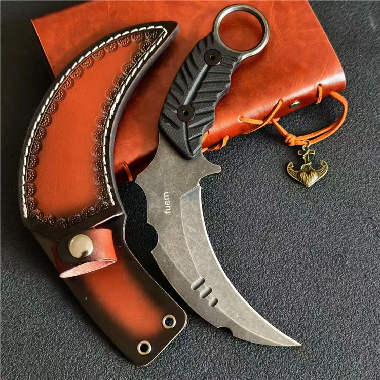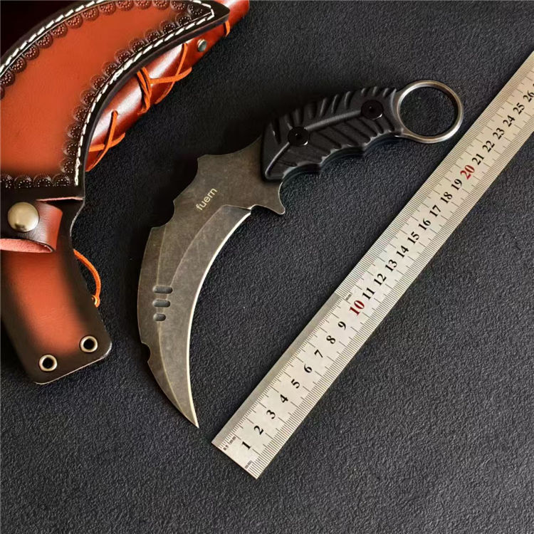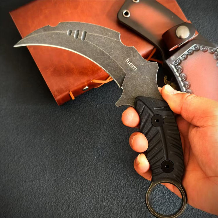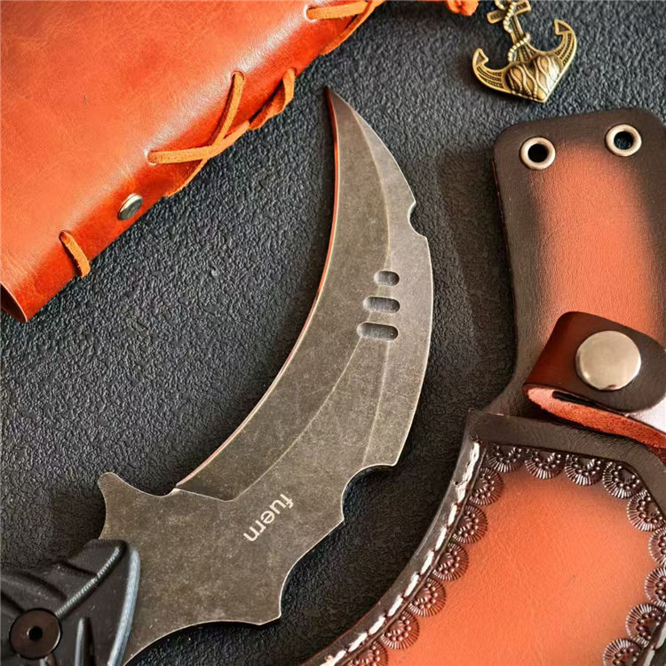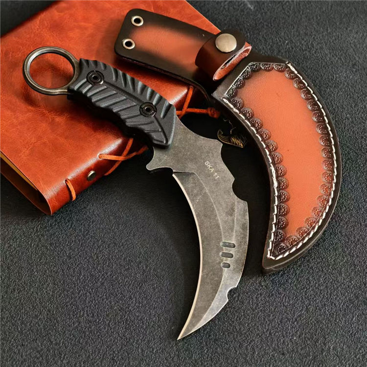 神龙爪刀 总长:23cm 刃长:12cm 刃厚:5mm 刃宽:3.9cm 钢材:SKA11钢真空热处理 硬度:59-60HRC 柄材:G10 刀套:皮套 盒装:硬手工盒子 重量:289g(含皮套352g)