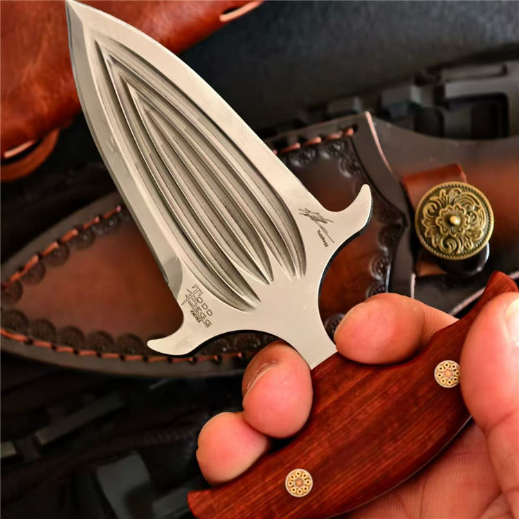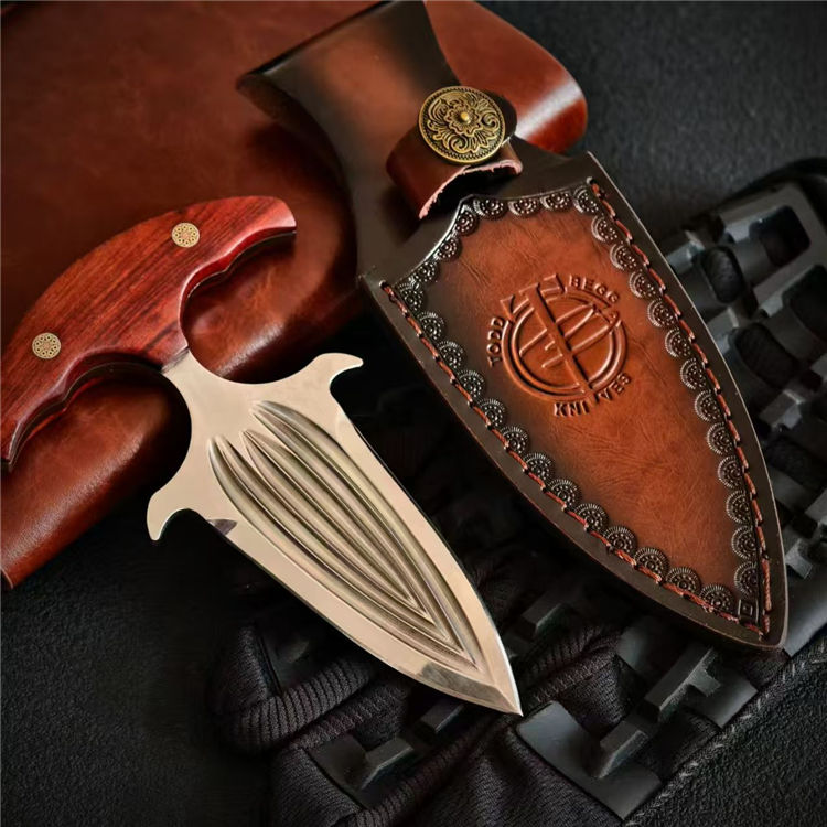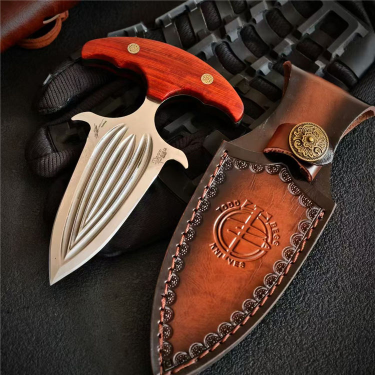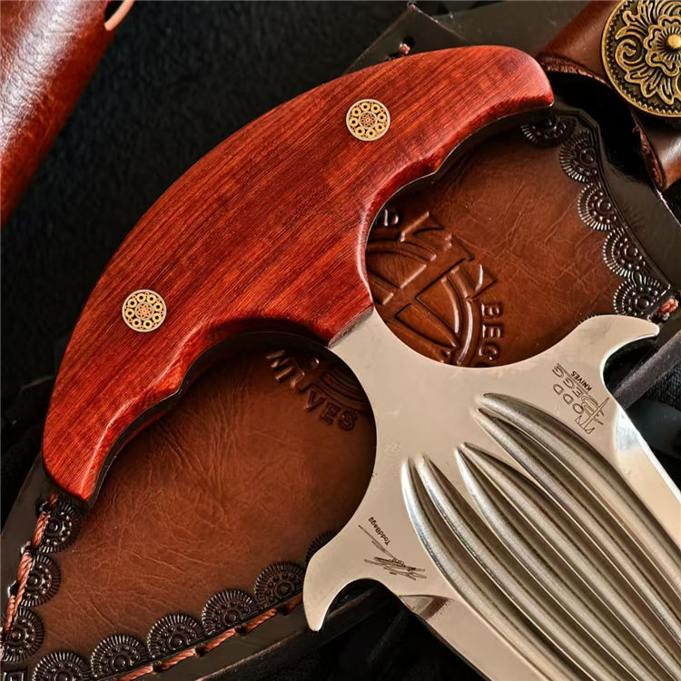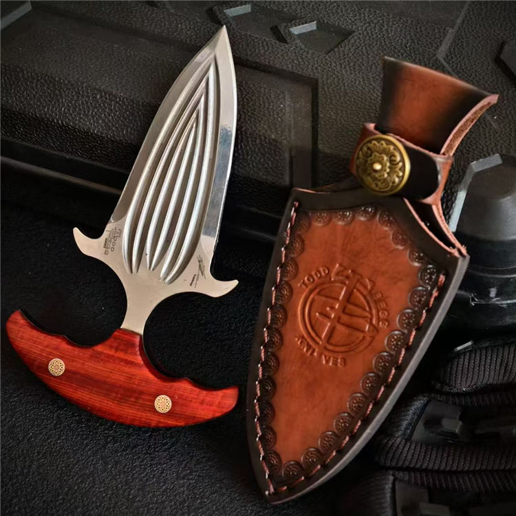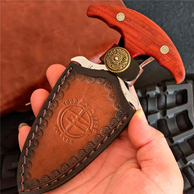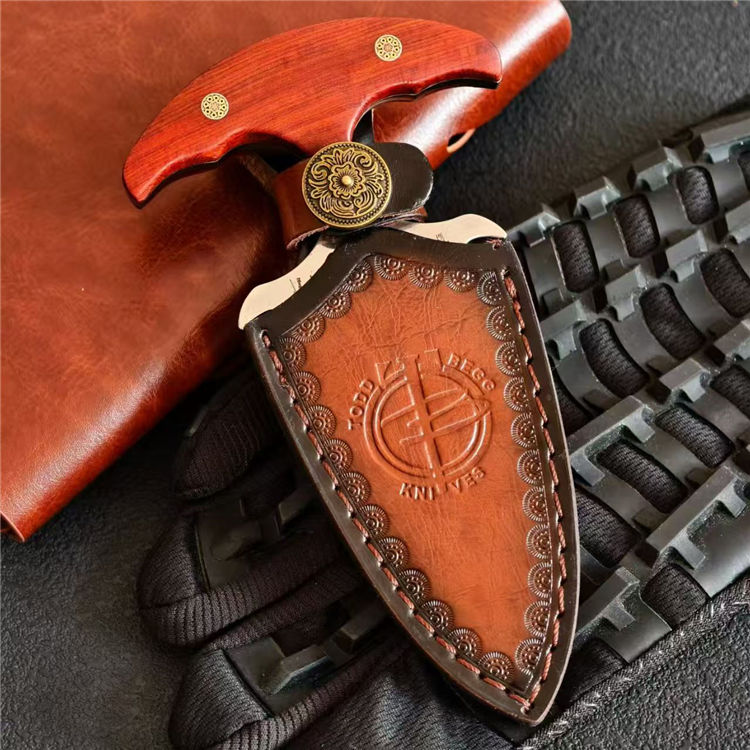 托德·贝格六曹手刺 全长:14.4cm 刃长:7.5cm 钢厚:5mm 钢材:D2 柄材:红檀 重量:153g(含皮套194g)