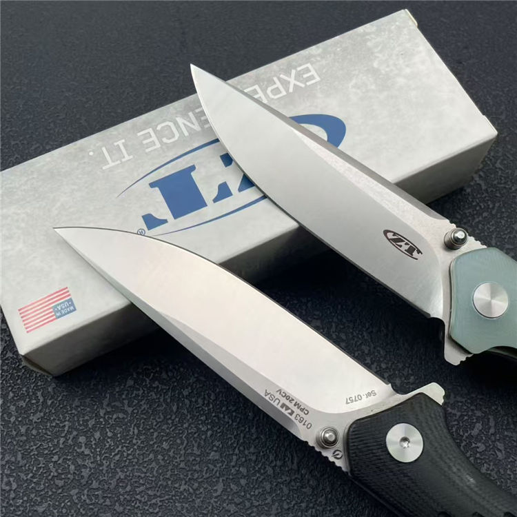 零误差ZT0163折刀 全长:20.5cm 刃宽:2.5cm 刃长:9.3cm 柄长:11.5cm 刃厚:3mm 刃材:CPM20CV 柄材:钢片+G10 刀重:109G 毛量:127G 硬度:59-60HRC 包装:礼盒